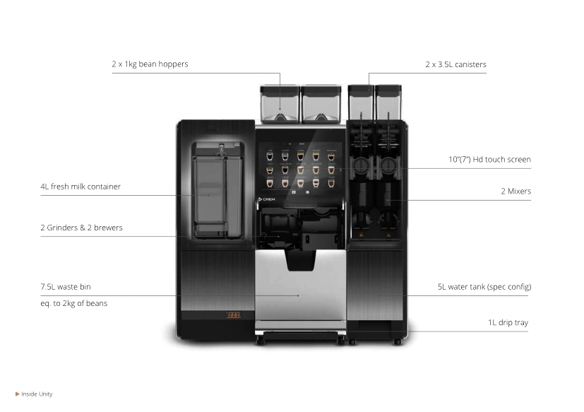 UNITY 是CREM集團旗下SPENGLER全新設計AI智慧型咖啡機,強大WifI 後台支援技術及電子支付功能,是未來的科技咖啡機的領先者。
