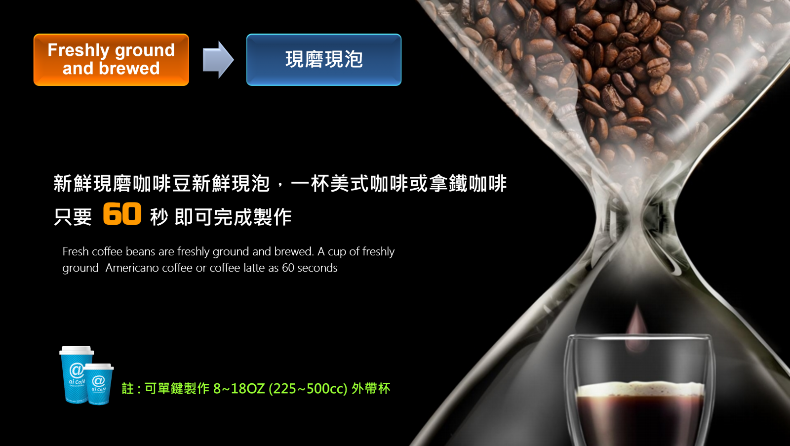 7. 大杯咖啡 : 單鍵單次製作8~18oz(500cc)外帶杯咖啡。