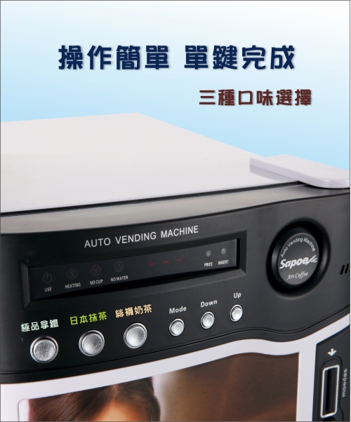 3. 多種飲料 : 三組物料槽可銷售多種商品,如日本抹茶,黑咖啡,抹茶拿鐵,咖啡拿鐵,港式奶茶等..多種產品。