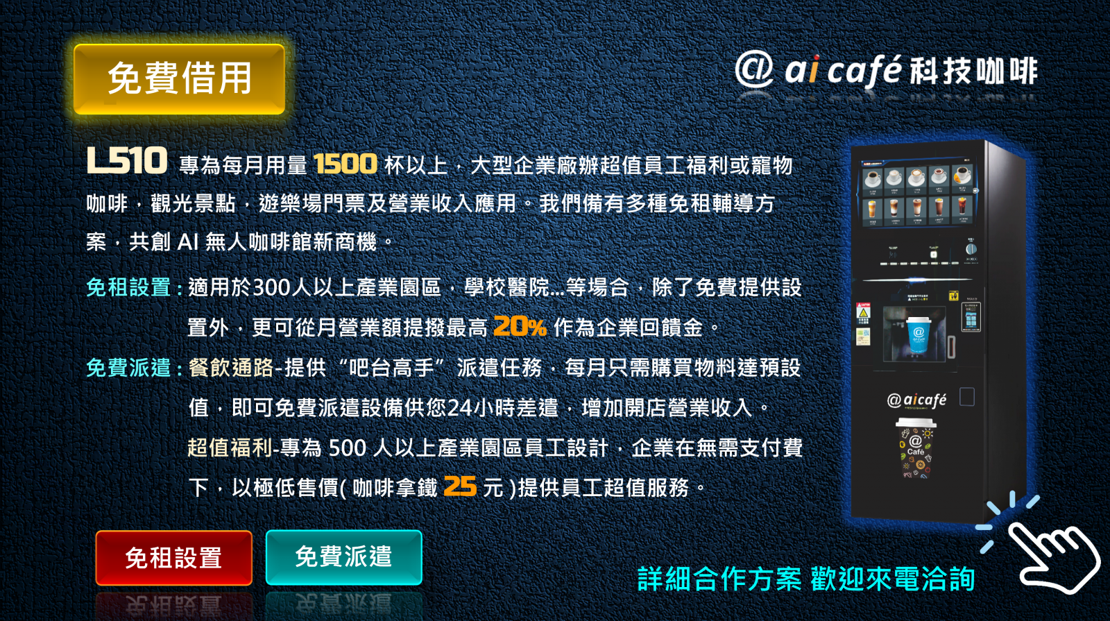 @ ai cafe 可依照您創業經營或員工福利的不同需求,提供 自購優惠+一年租借+三年分期+免租設置+免費派遣 五種合作方案選擇。
