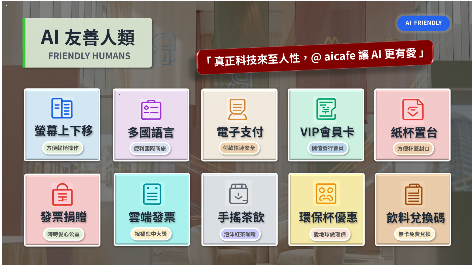 "AI 的愛"針對行動不便輪椅人士,雙點餐螢幕,退款鍵,兌換碼,置杯台...等功能,下移至友善操作位置。