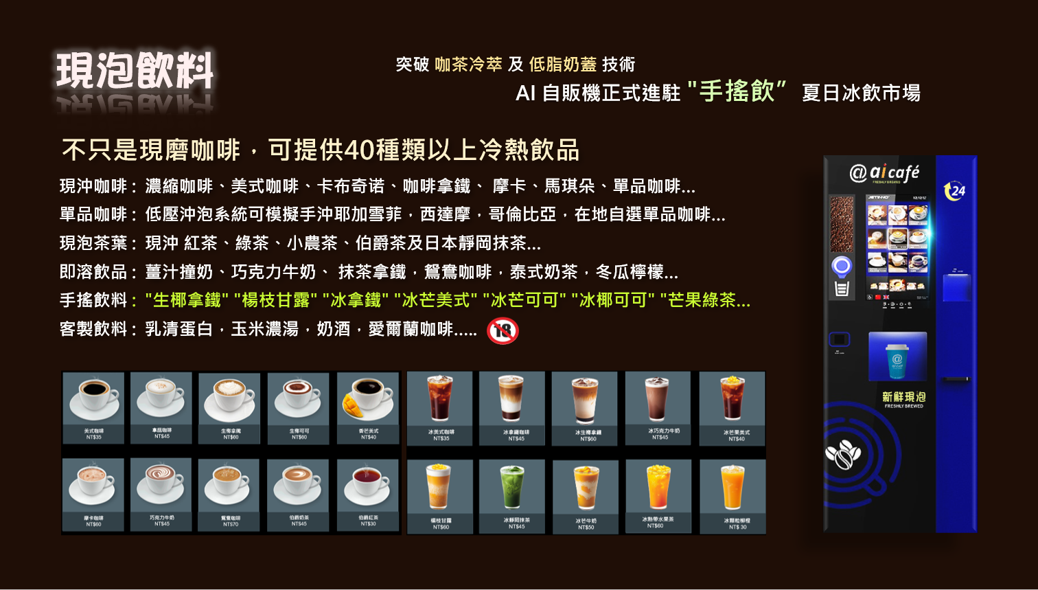 輪椅及不便人士專用點餐螢幕,多國語言功能,客製化口味調整,16oz超大杯飲料,雲端發票生成,愛心發票捐贈,VIP會員卡,無卡取貨碼,環保杯折扣,杯蓋分配器,蓋杯置放台,自動升降門,遠端自動清洗..等功能,這都是AI智慧對人類提供友善的服務。