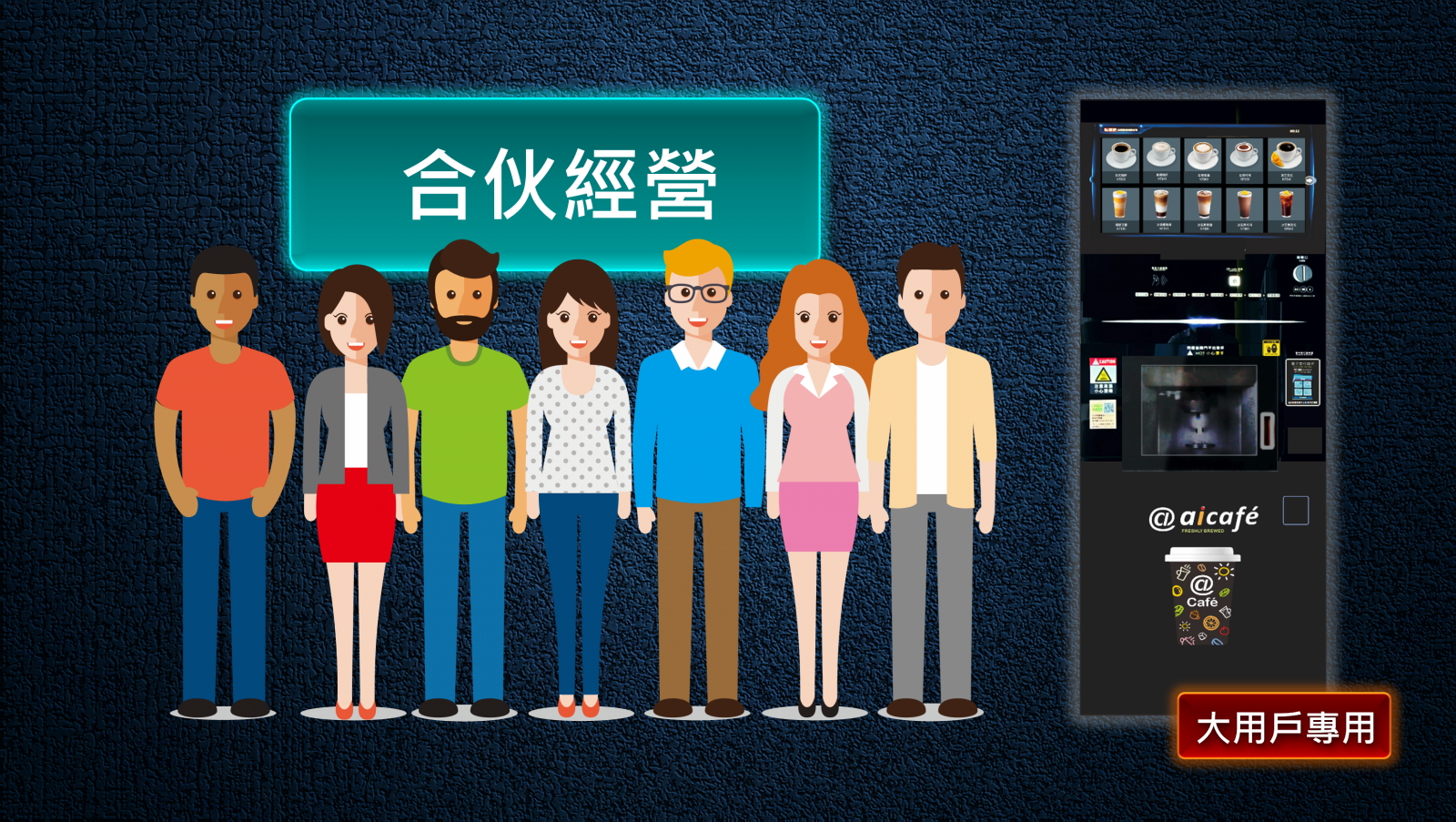 "合伙經營"是專為營業場所及大型企業大用量客戶設計。合作對象只需每月購買固定金額物料,@ ai cafe 即免費派遣 L510 "吧台高手"AI 無人自販機,供您 24 小時差遣服務。