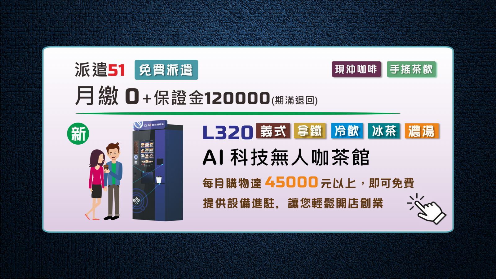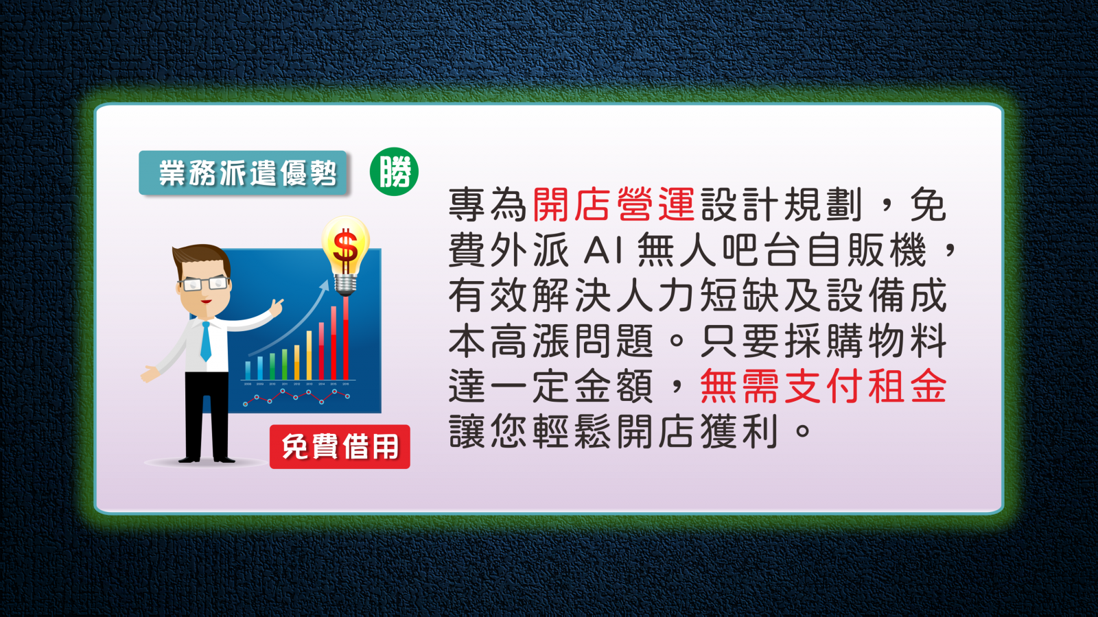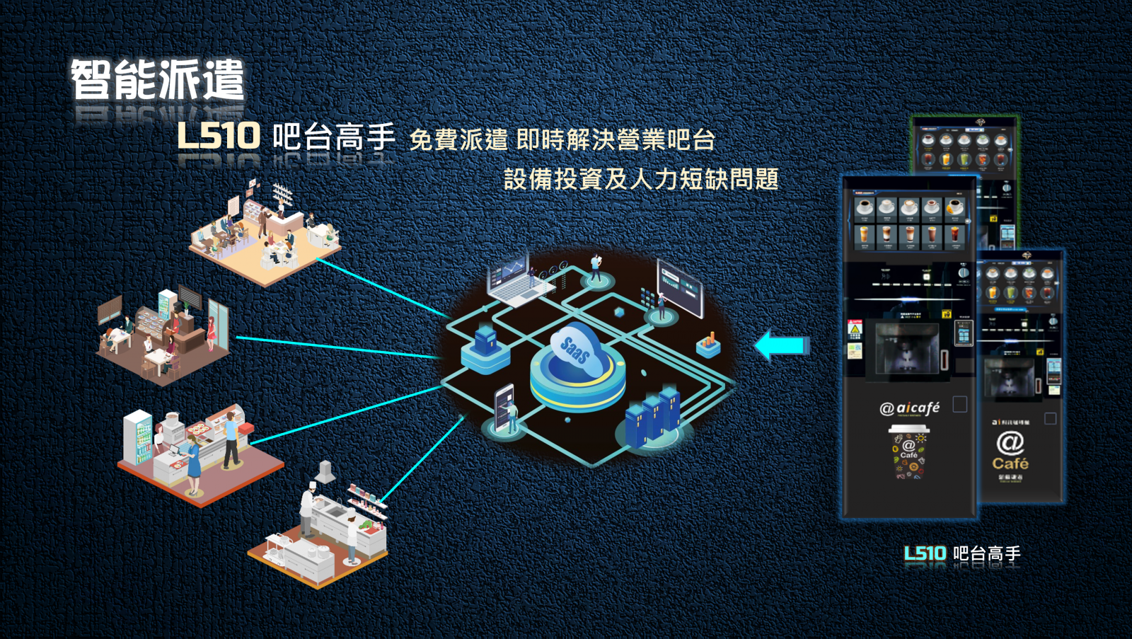 "免費派遣" 專為商業營業空間,因吧台人力短缺設計的免租借機方案。您每月只需固定採購定額物料,@ ai cafe 即可免費派遣 "L510 吧台高手" 供您 24 小時差遣服務,共同經營 AI 無人科技咖啡市場。