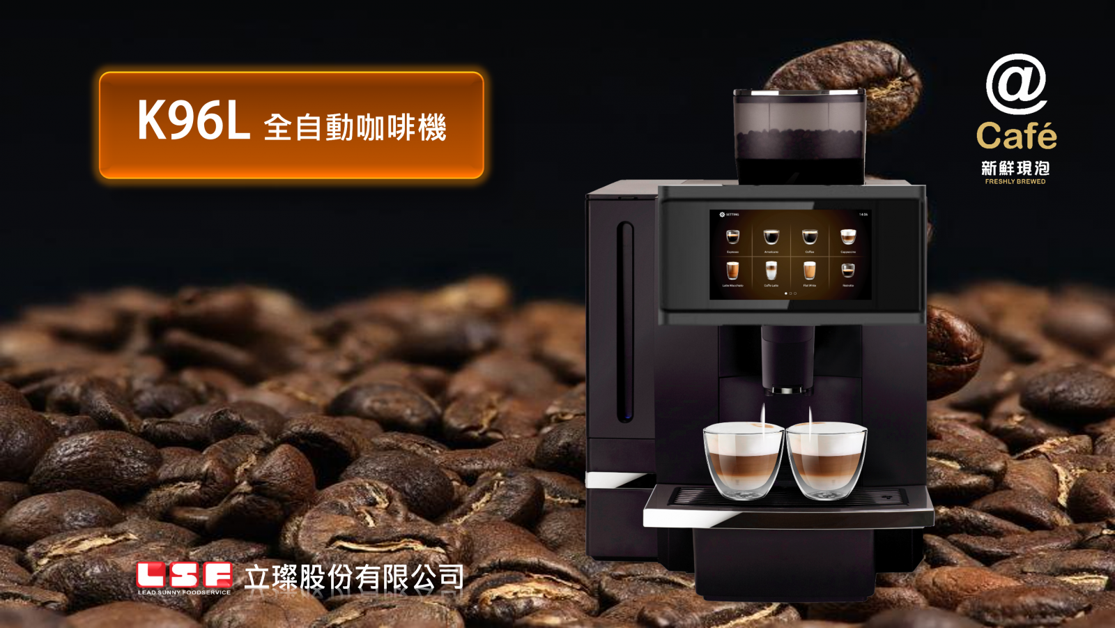 新款觸屏全自動拿鐵咖啡機,透過觸控螢幕中文介面,清楚個別標註不同產品圖檔,操作,維護顯示。並針對市場500cc大容量外帶杯需求,專利設計單鍵兩段式萃取沖泡方式。可以製作超過20種含鮮奶咖啡飲料產品,非常適合早餐店,外帶飲料店,自助百匯,咖啡店,旅店民宿,便利商店,辦公室場合使用。