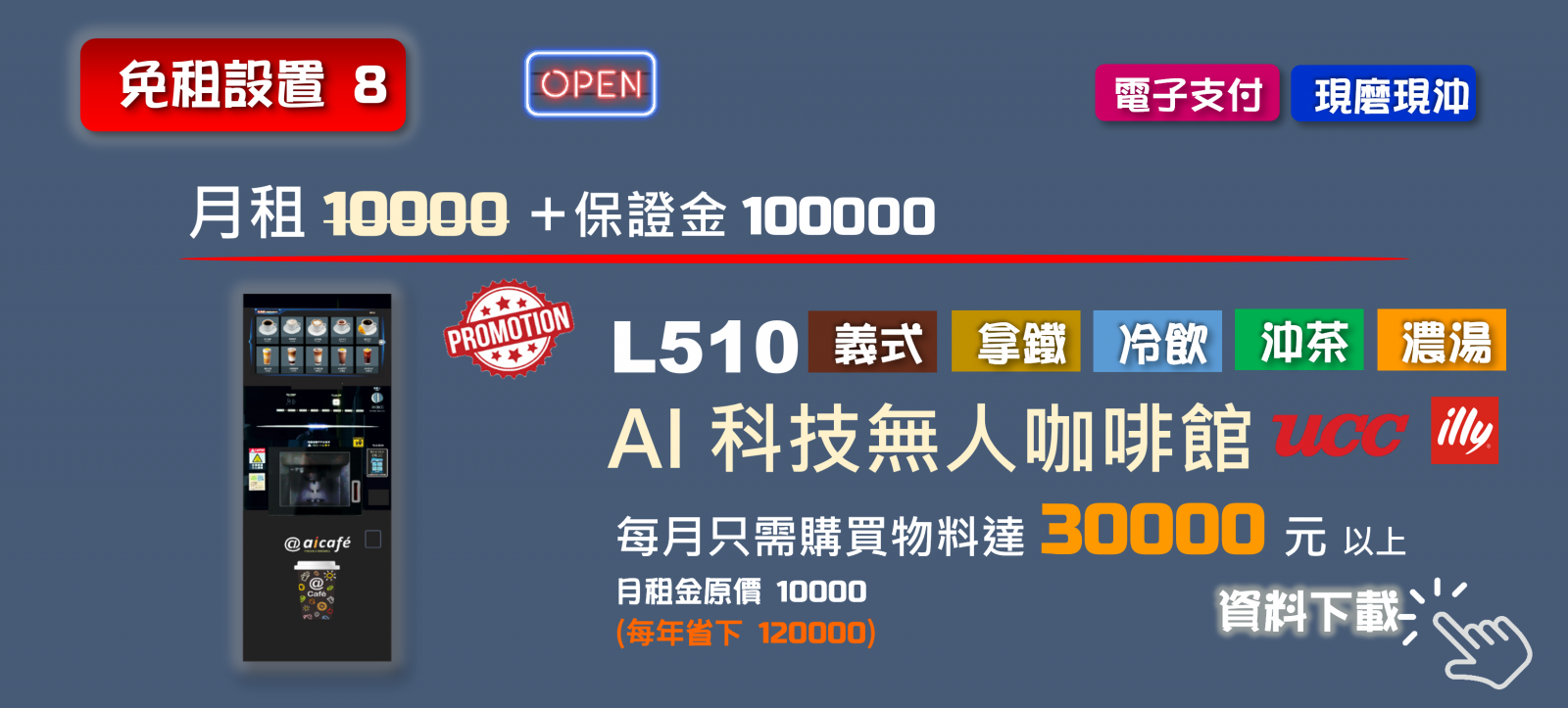 中大型企業辦公室咖啡大用戶,今後無需再支付月租金,每月只要購買物料達5000 元以上,ai cafe 即可免費提供多種不同自助吧台組合,輕鬆創建企業VIP貴賓室。