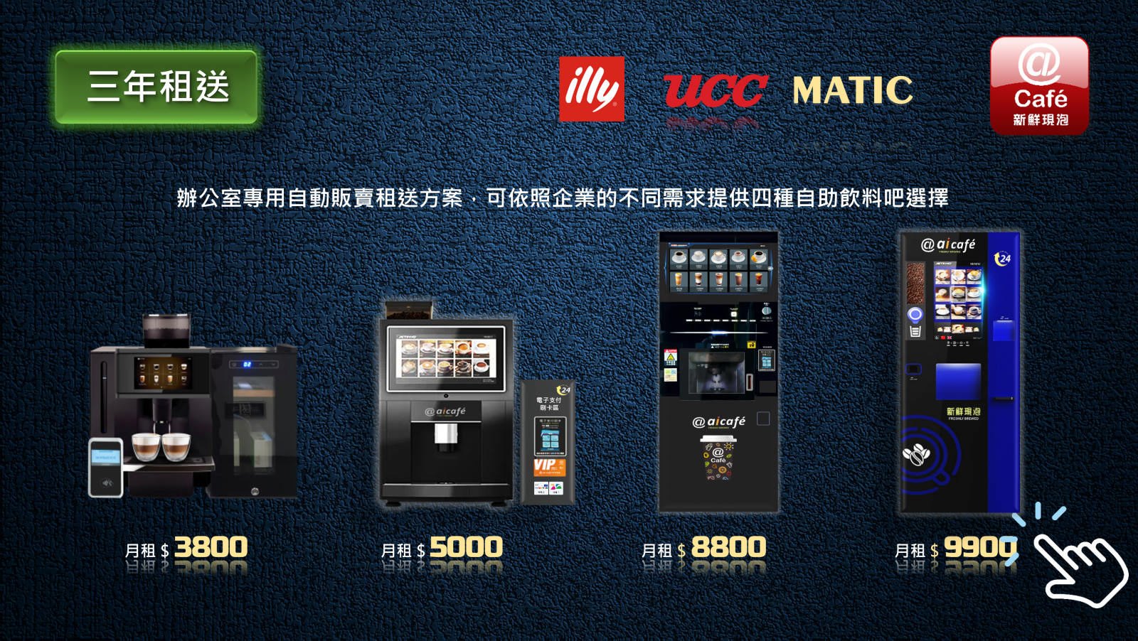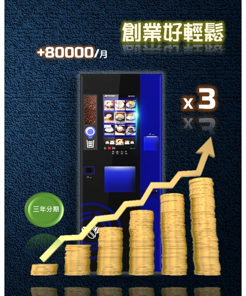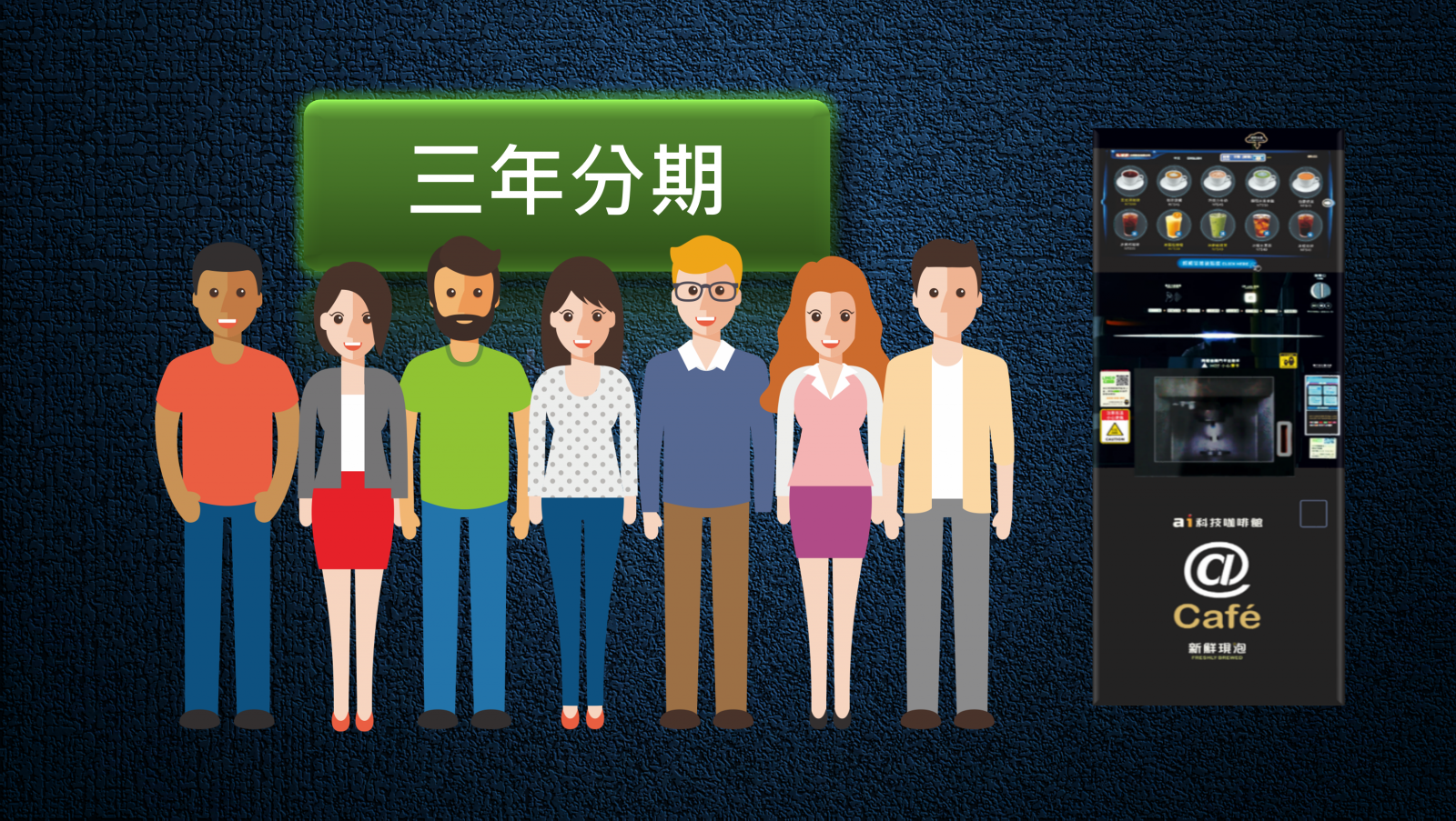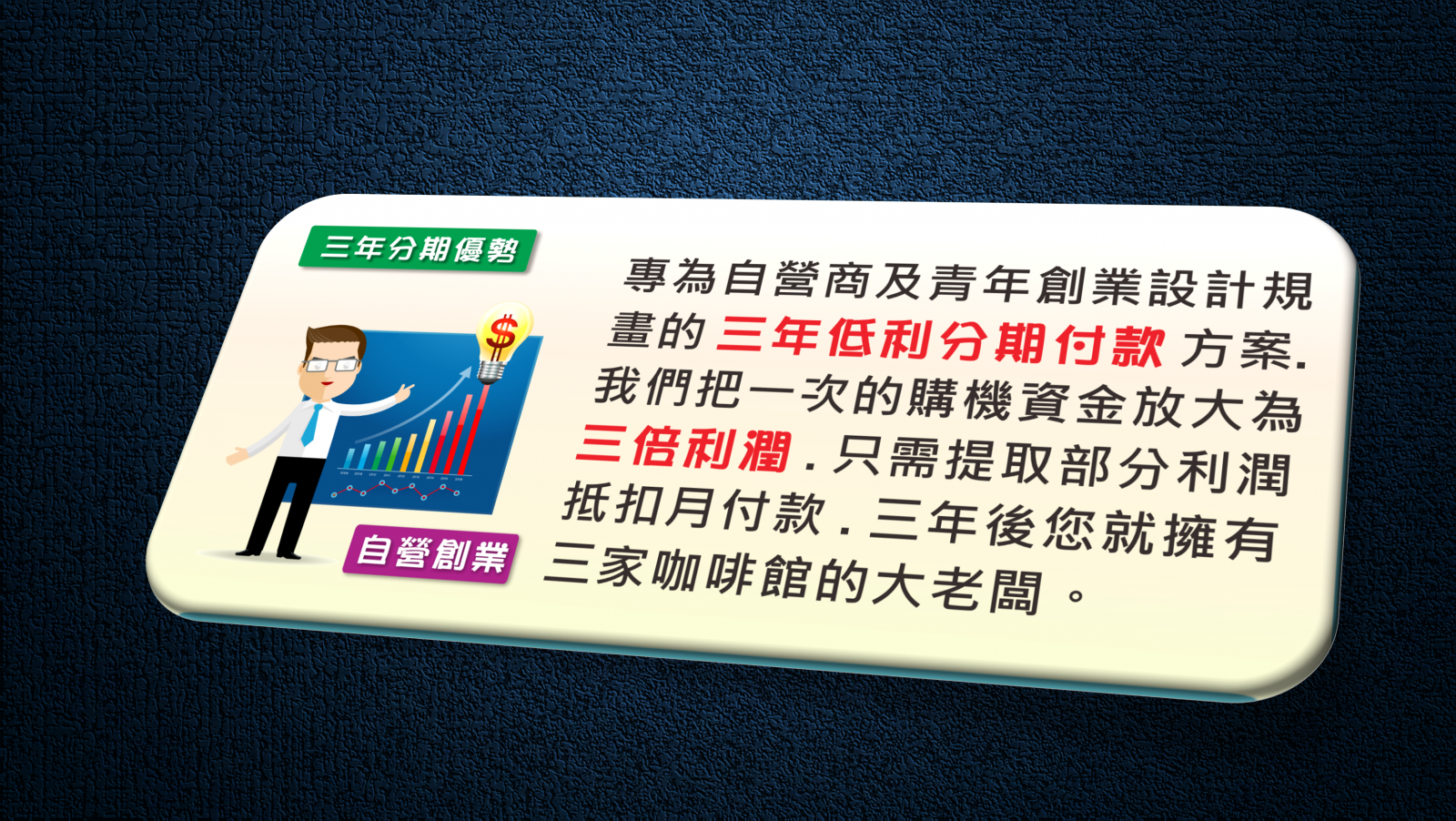 專為自營商創業投資設計方案,您可以把一台購機資金,分租三台設備。您的資金一下擴大為三倍營業收入並且可有效分擔"單機"市場營業風險。而後每月部分營業收入抵扣分期付款,三年後您就成為是真正擁有三台設備的連鎖咖啡店的大老闆。