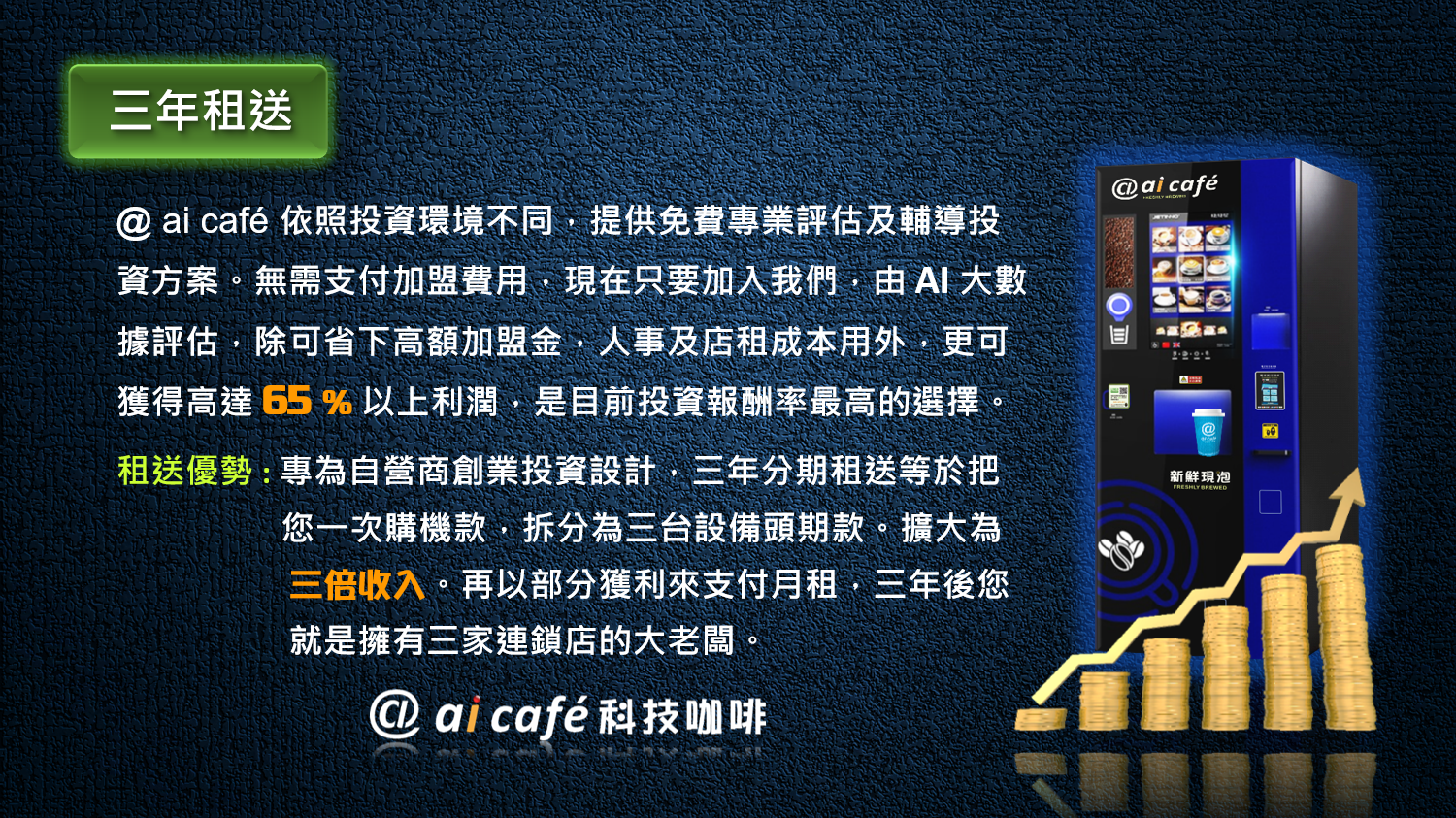 @ ai café 依照投資環境及人數不同,AI 專業評估選擇最有利的投資方案。現在加入除可省下高額加盟金,人事及店租成本用外,飲料高達 65 % 獲利,是目前投資報酬率最高的選擇。