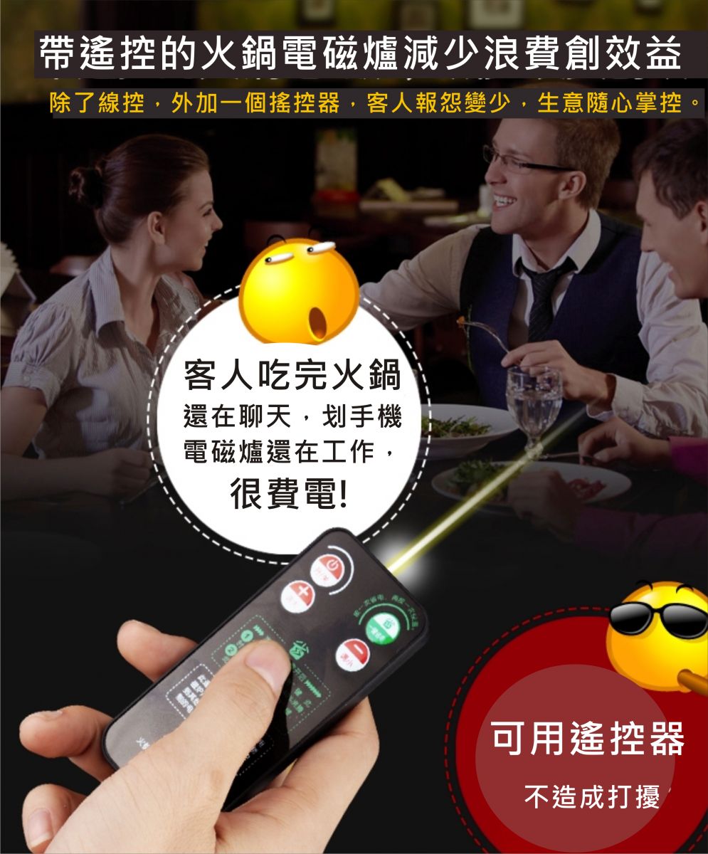 全新開發遙控+線控兩用裝置 客人可以安全輕鬆閱讀及操控火力大小。店家也可以自行遙控火力大小或關閉,可避免過多提醒客戶引起抱怨!