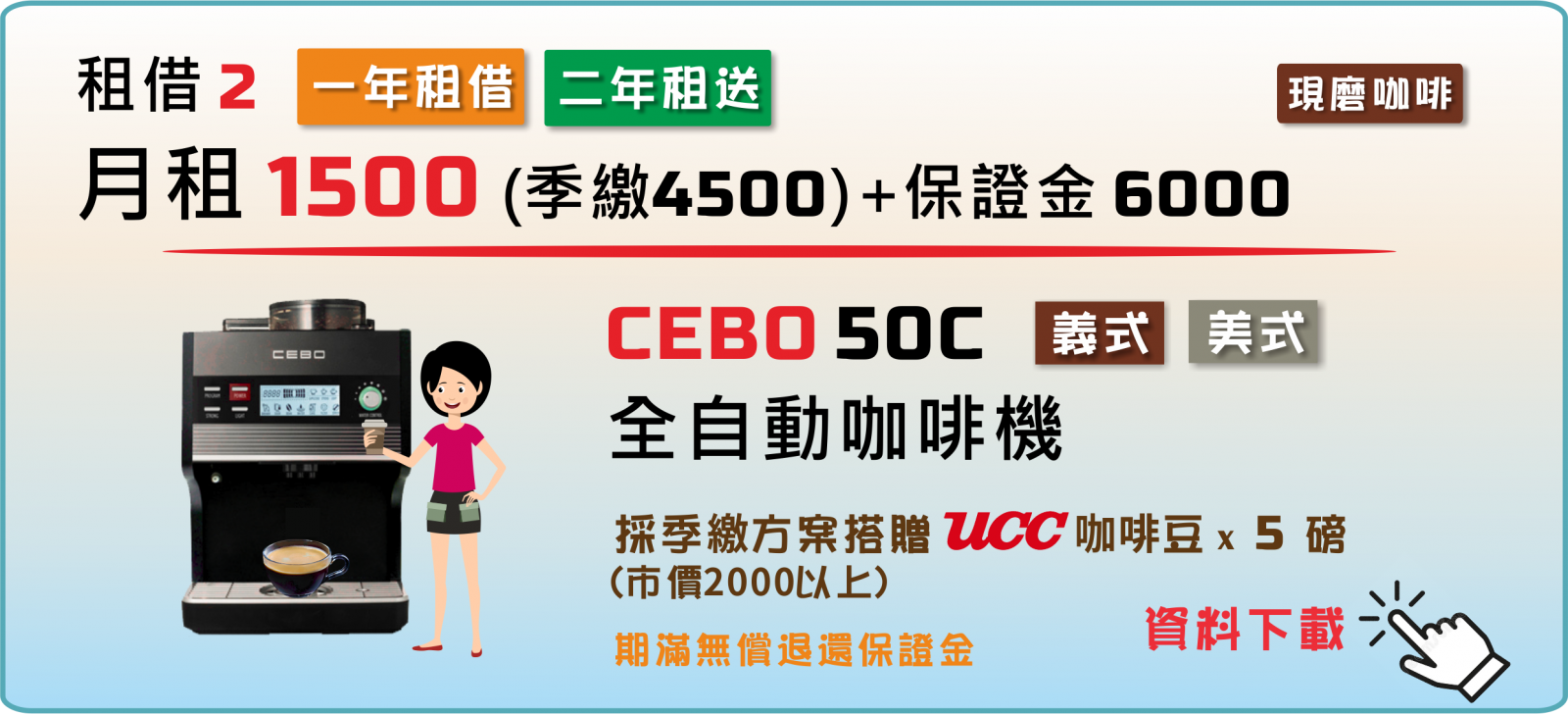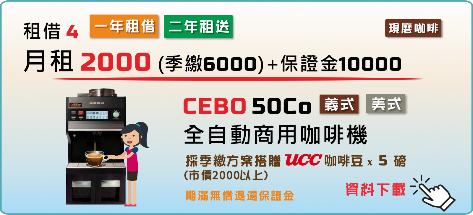 獨創月租金採季繳方式,每季(三個月)搭贈 5 磅 UCC 咖啡豆(市價2250元)...等商品。