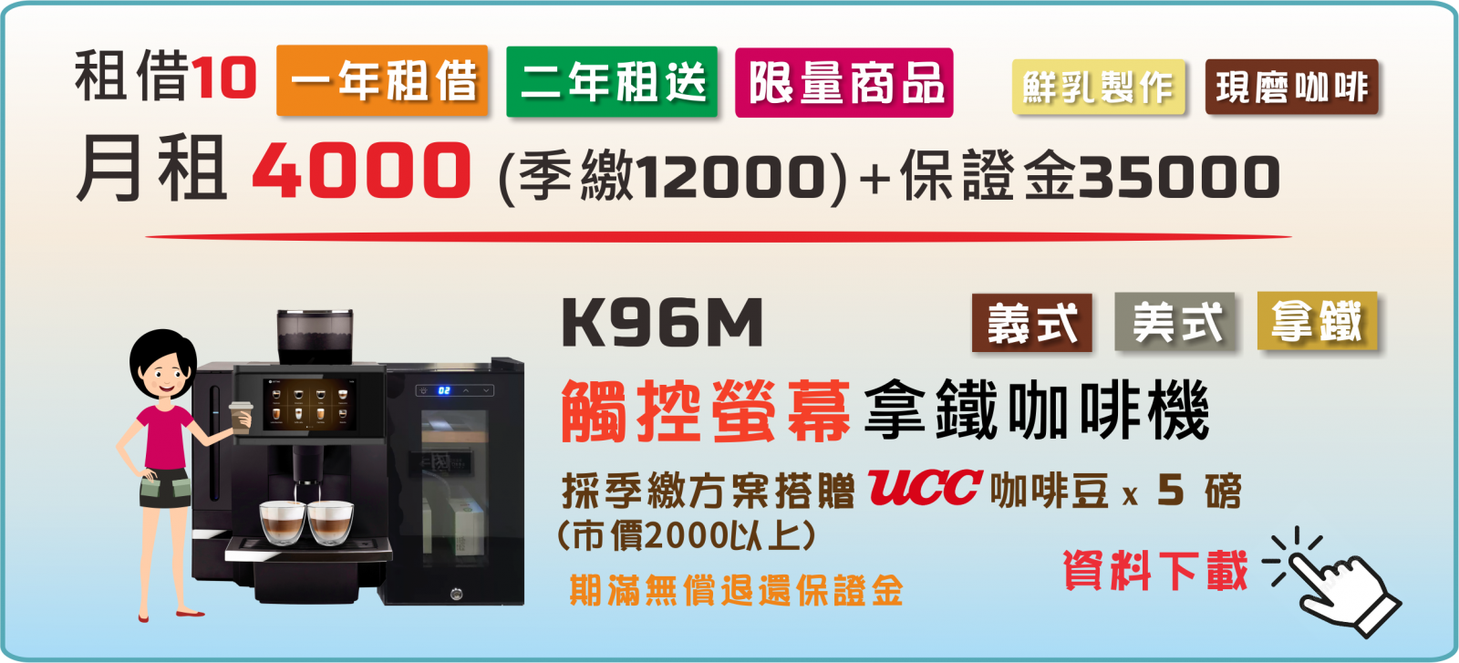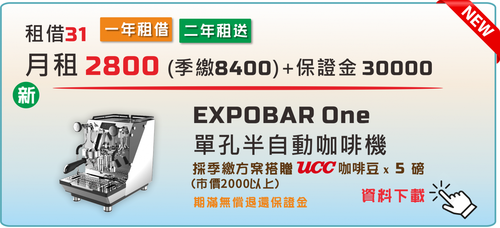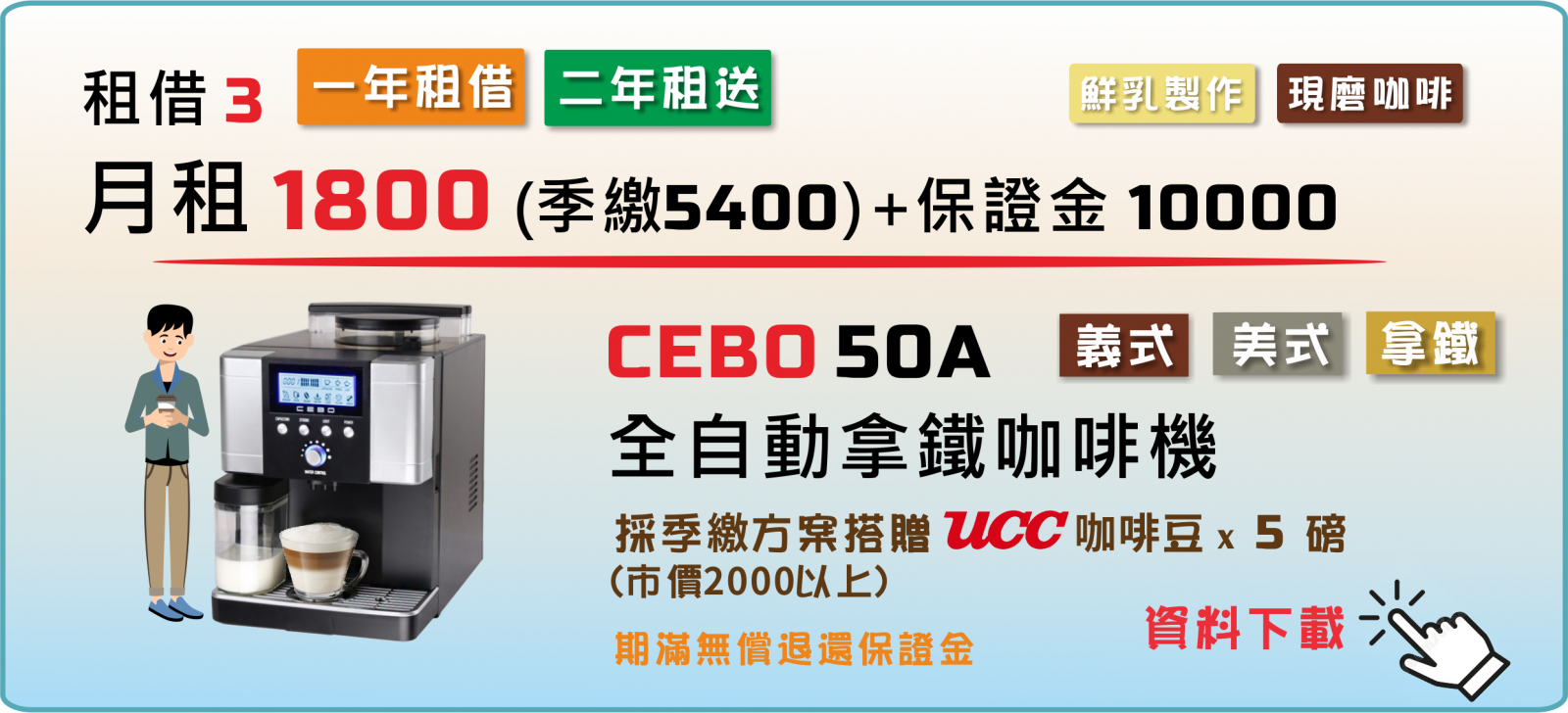 市場唯一不用擔心中途解約,被扣押金的方案! 當"一年租借"連續兩年期滿後,再由您再決定退還保證金或轉為購機尾款,明天您就咖啡的主人。