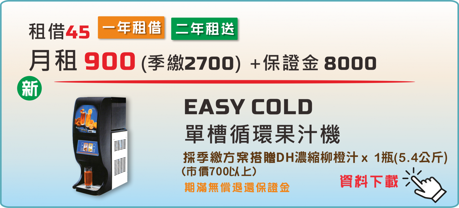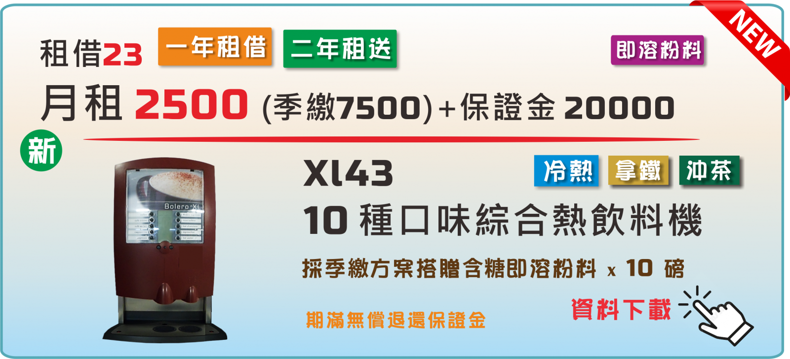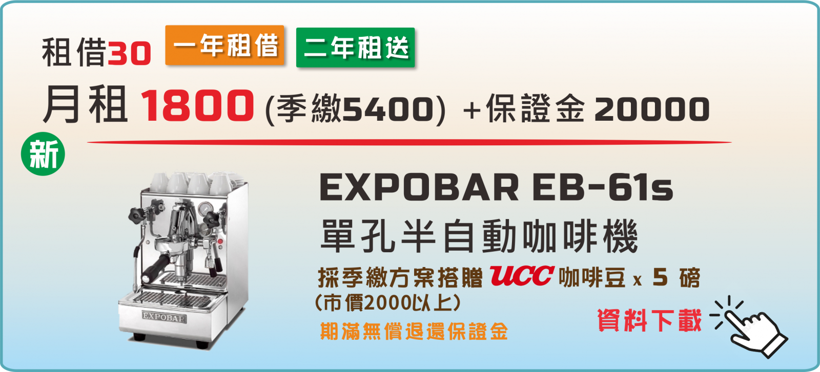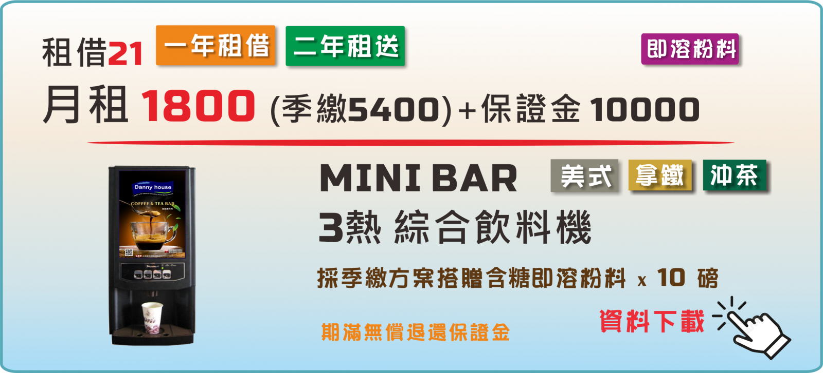 市場唯一不用擔心中途解約,被扣押金的方案! 當"一年租借"連續兩年期滿後,再由您再決定退還保證金或轉為購機尾款,明天您就咖啡的主人。