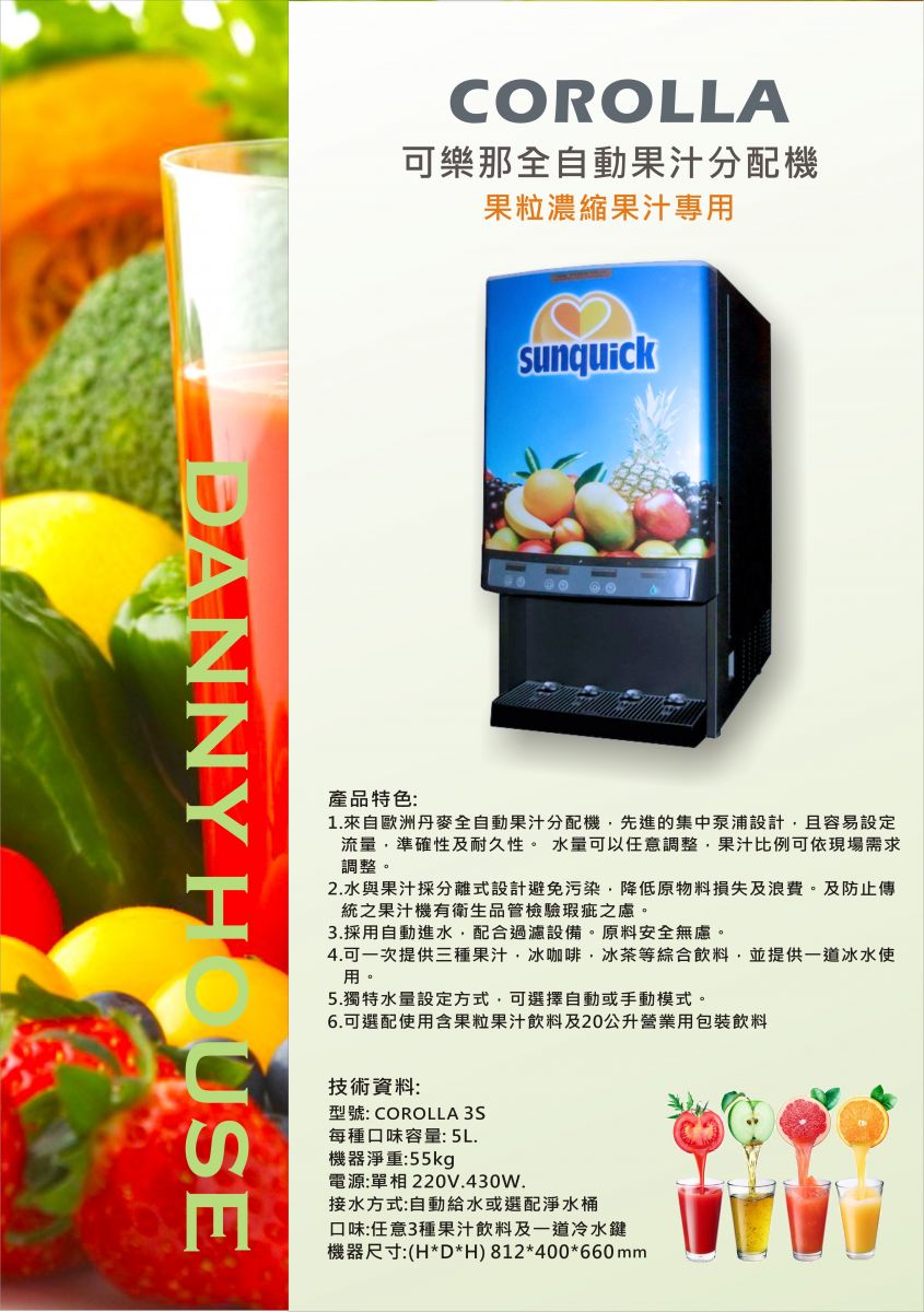 - 可供應三種口味含果粒果汁及一道冰水供應鍵