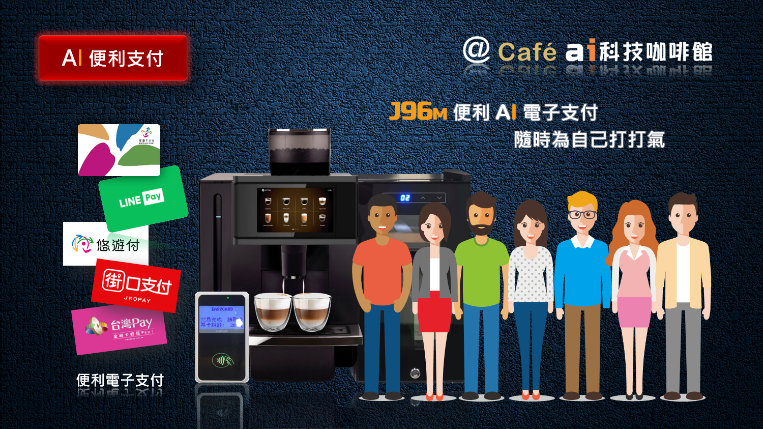 J96M AI自販機多元電子支付設計,任何支付方式,只需直接靠卡或掃描3~5秒鐘即可完成支付,無需等待立即製作一杯好咖啡,這是全新 @ ai cafe 科技帶來無人咖啡新的便利生活。