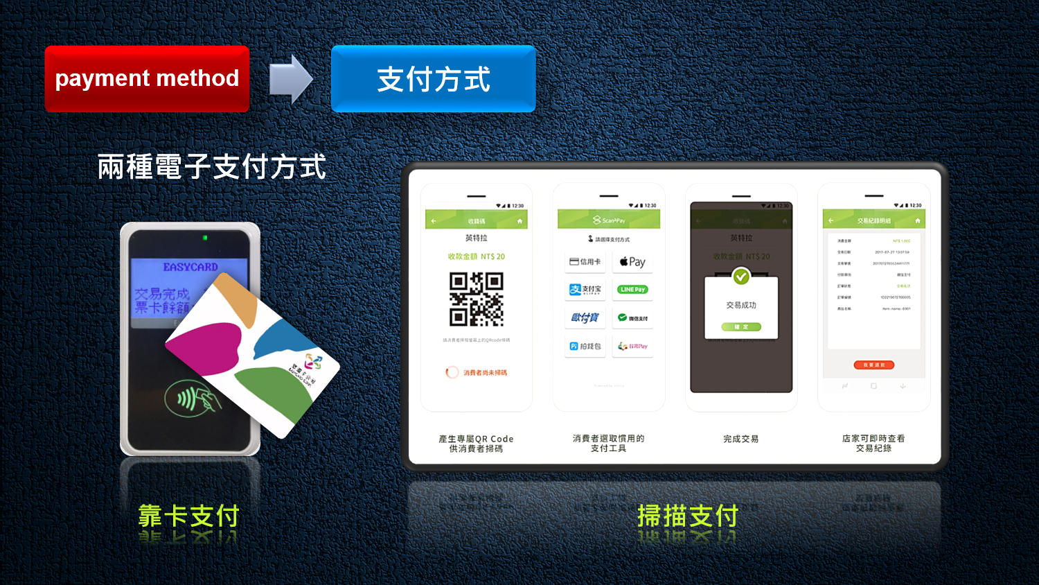 2. 電子支付 : 可使用悠遊卡,LINE PAY,TAIWAN PAY...等多種電子支付功能。