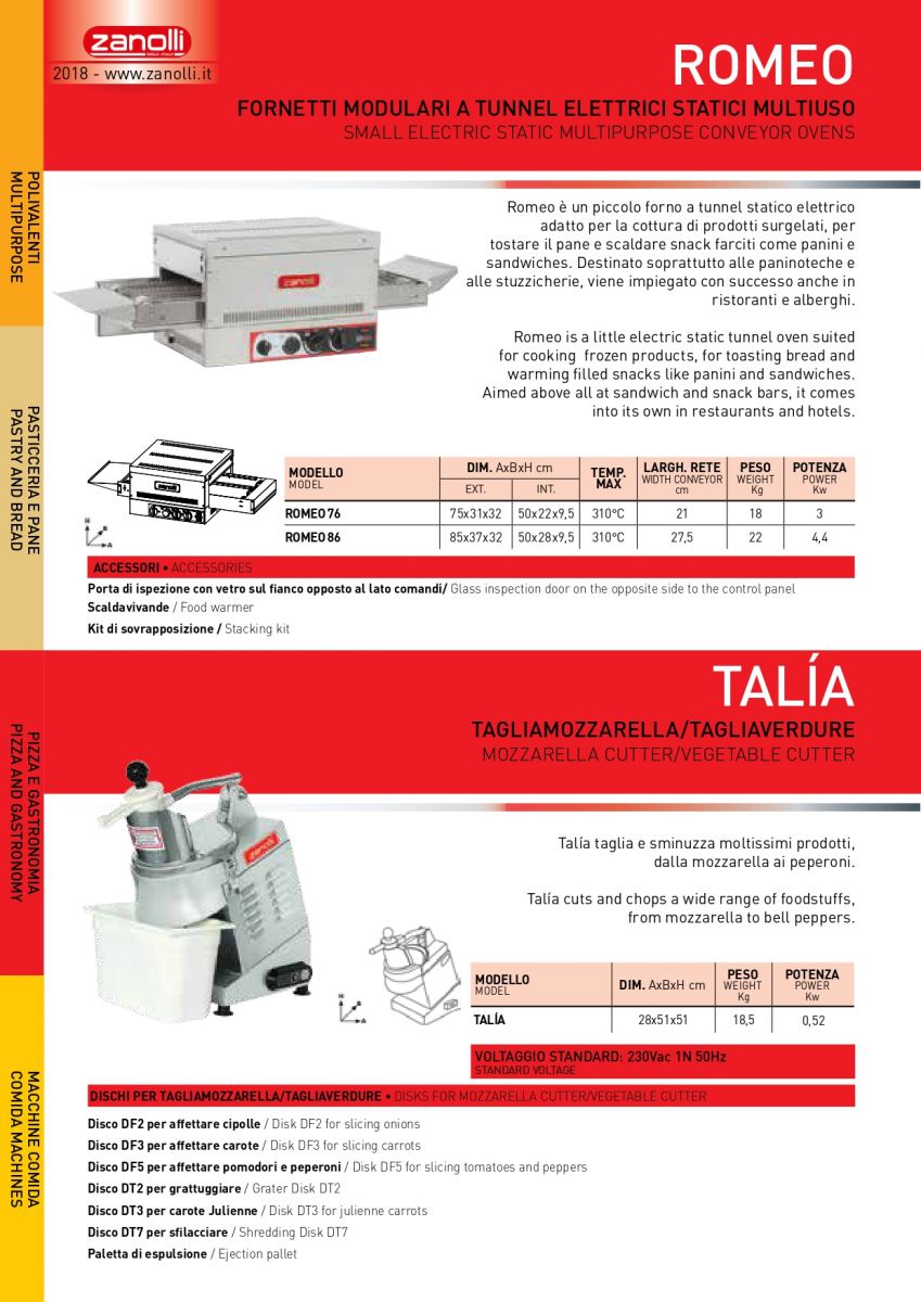 羅密歐(Romeo)是具有巨大潛力的小型隧道爐。是一款小巧的隧道式烤箱,可以烹製各種產品,例如吐司,帕尼尼(Panini),比薩餅等等。它是速食店和比薩店的最佳助手。隧道式烤箱完全由不銹鋼製成,並配有機電自動控制裝置,可獨立調節烹飪室頂部和底部的熱強度。輸送機速度根據所需的烹飪時間而變化,該烹飪時間可以從27-30秒到35分鐘不等。