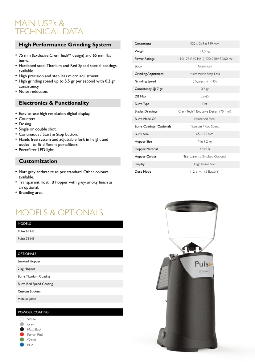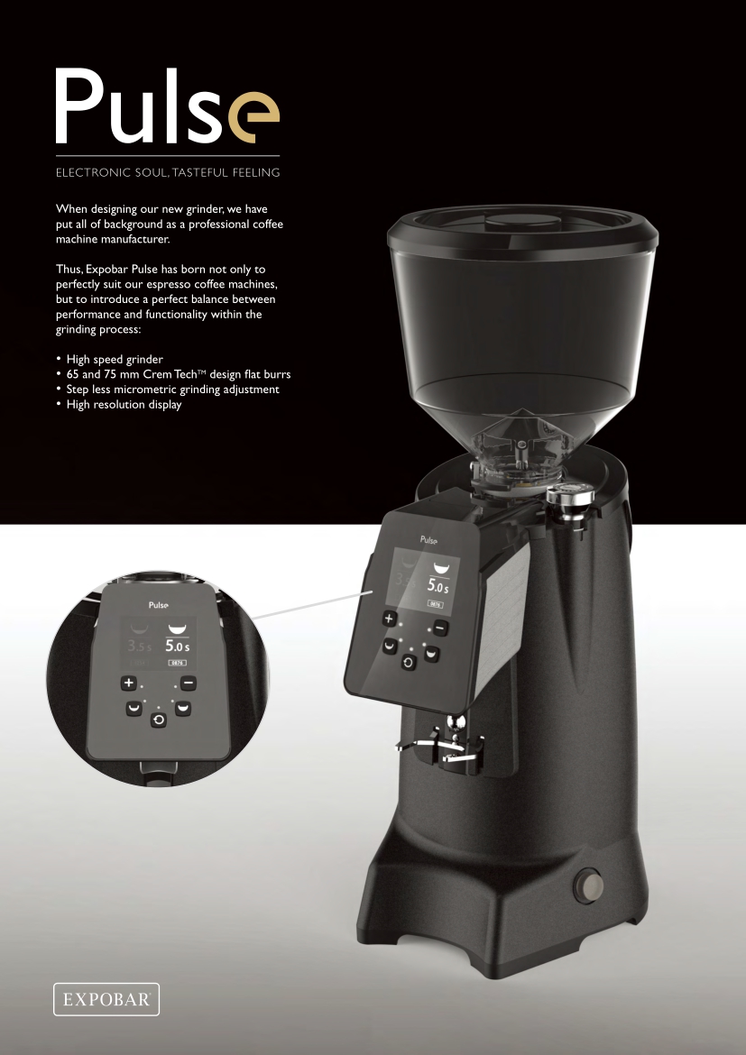 在設計我們的新研磨機時,我們充分考慮了作為專業咖啡機製造商的所有背景。因此,Pulse 的誕生不僅是為了完美適應我們的濃縮咖啡機,而且還在研磨過程中實現了性能和功能之間的完美平衡