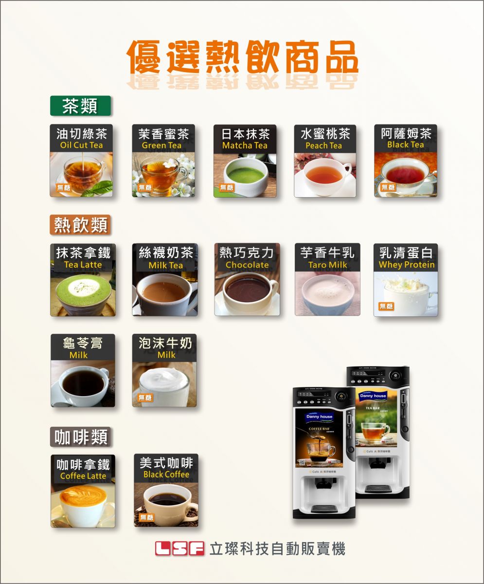 3. 多種飲料 : 三組物料槽可銷售多種商品,如日本抹茶,黑咖啡,抹茶拿鐵,咖啡拿鐵,港式奶茶等..多種產品。
