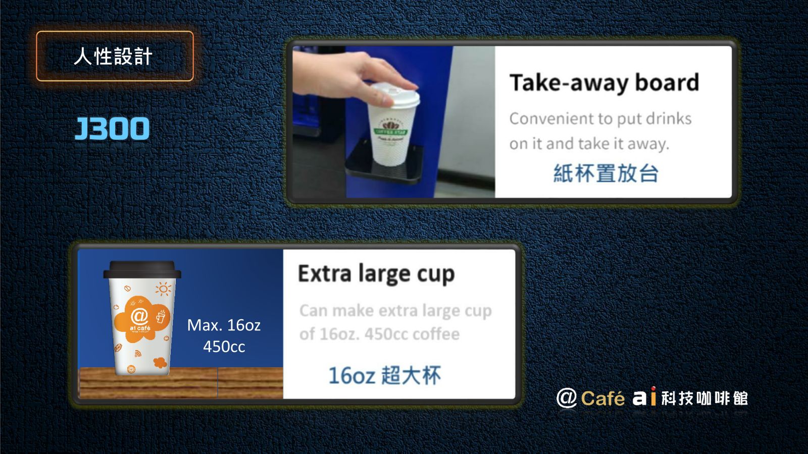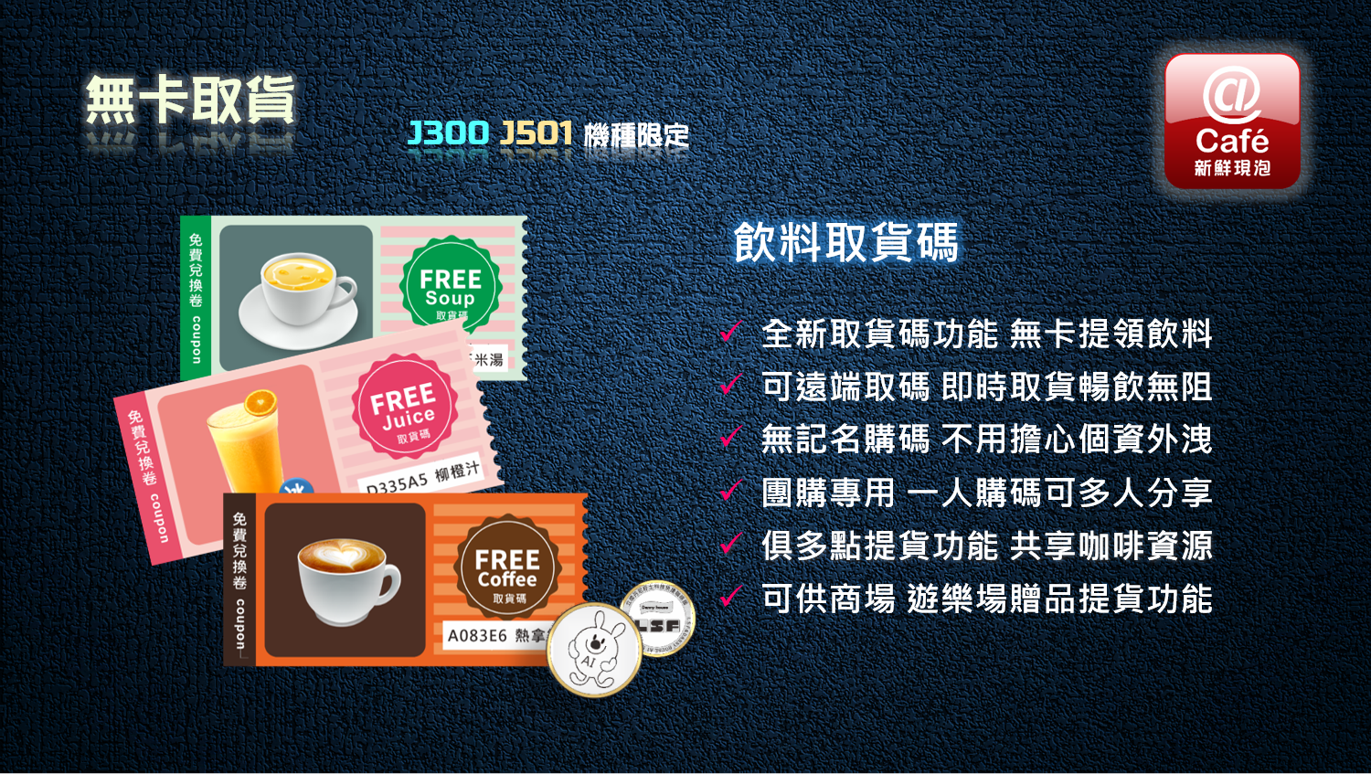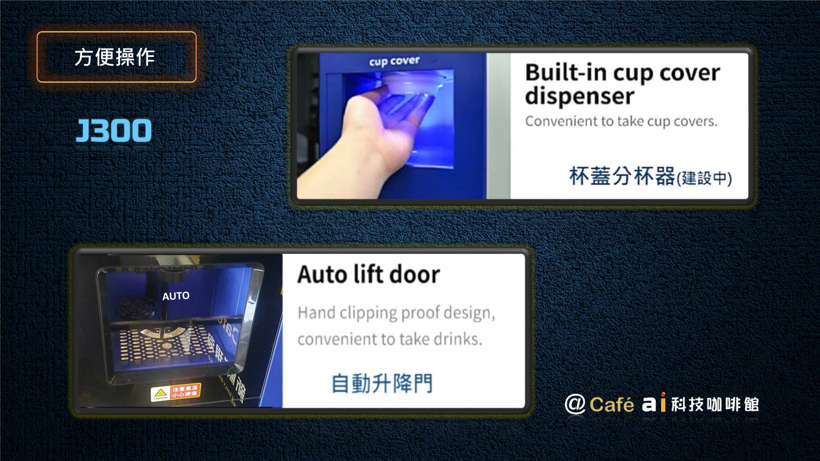 2024年 因應人力短缺及無人咖啡市場需求,我們自行研發全新 AI J300 無人咖啡館專用自販機。全新機種除了沿襲 J500 的優良 DNA 外 ,我們創建12項全新功能,J300 不再只是一台自動販賣機,而是更俱有人工智慧及對人類友善的 AI 智慧販賣機,新的人工智慧可客製化協助企業有效節省人力及控制開店營運成本。