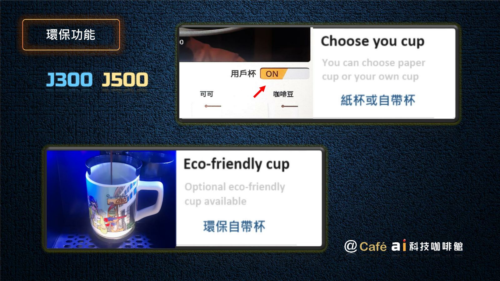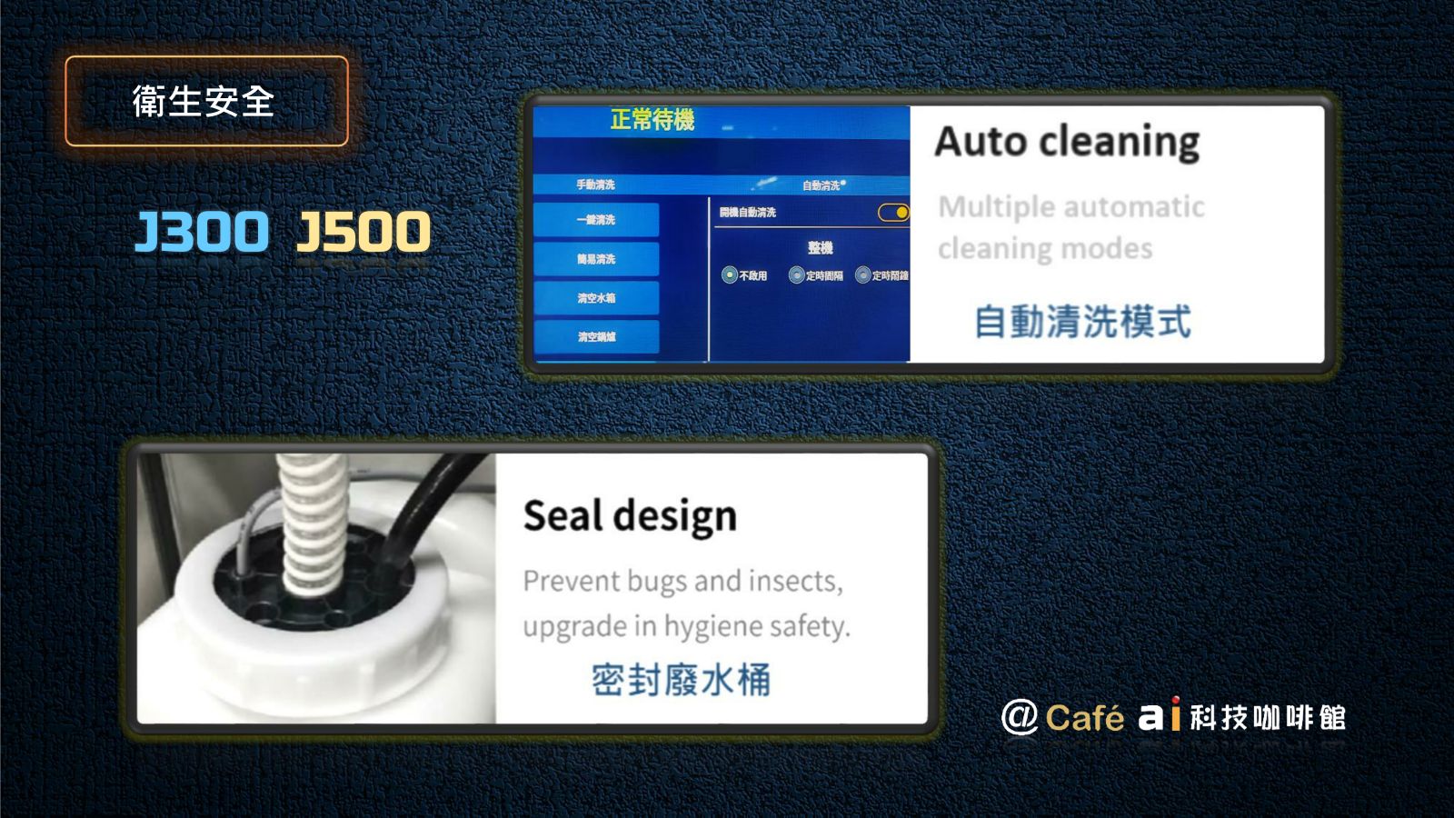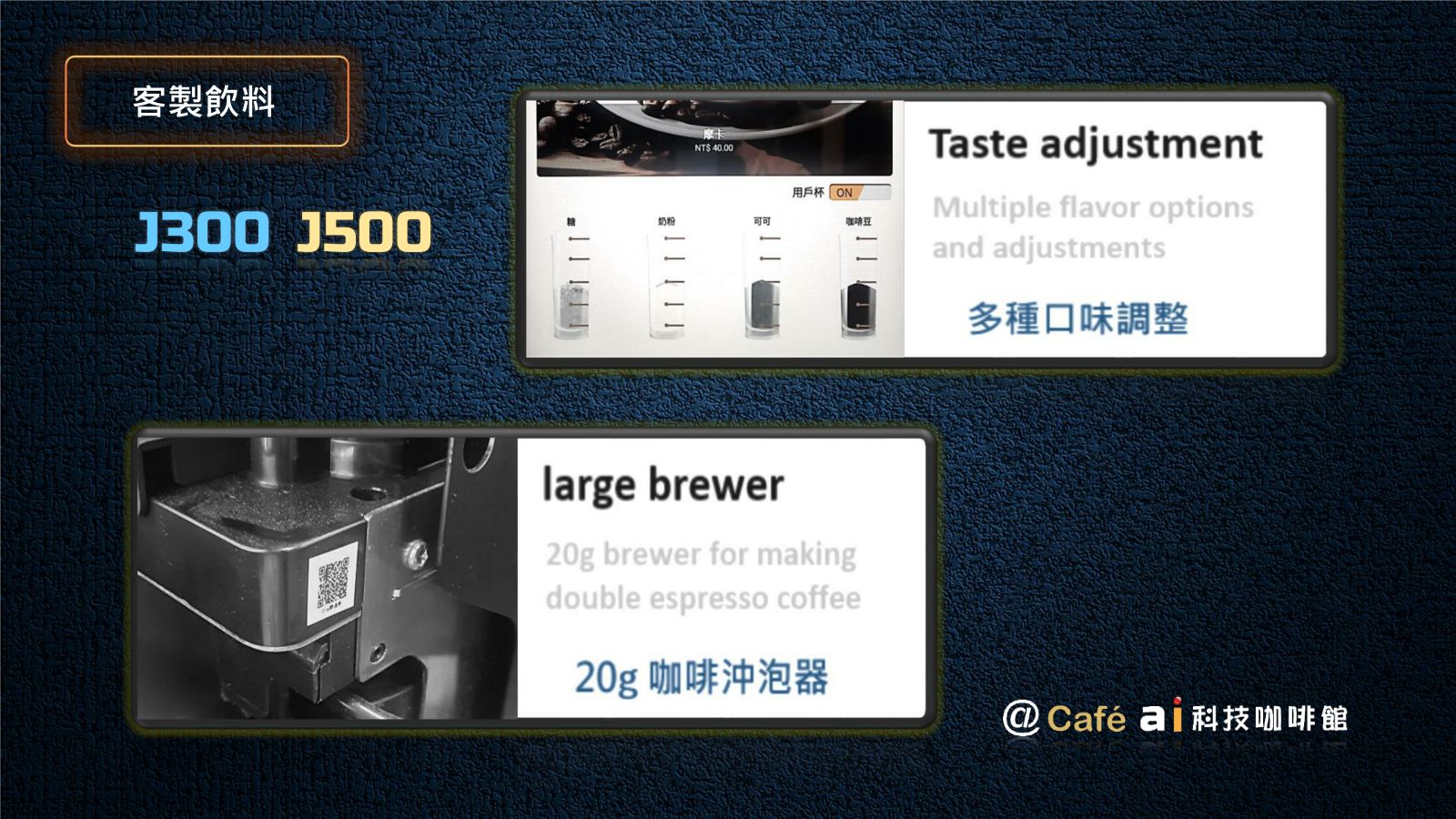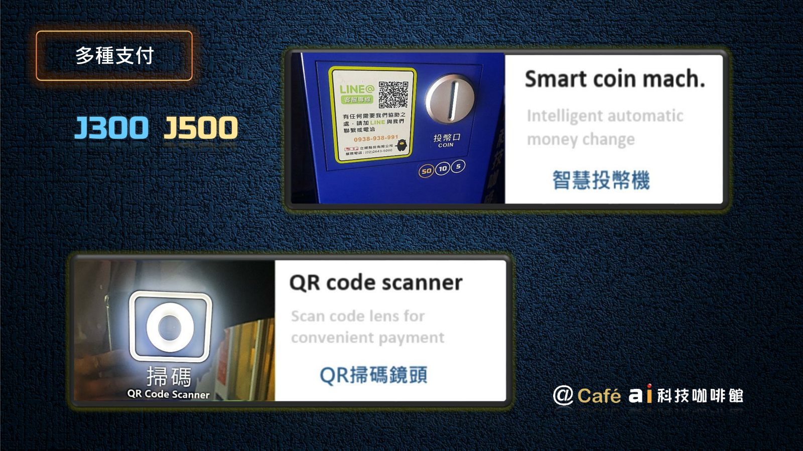 2024年 因應人力短缺及無人咖啡市場需求,我們自行研發全新 AI J300 無人咖啡館專用自販機。全新機種除了沿襲 J500 的優良 DNA 外 ,我們創建12項全新功能,J300 不再只是一台自動販賣機,而是更俱有人工智慧及對人類友善的 AI 智慧販賣機,新的人工智慧可客製化協助企業有效節省人力及控制開店營運成本。