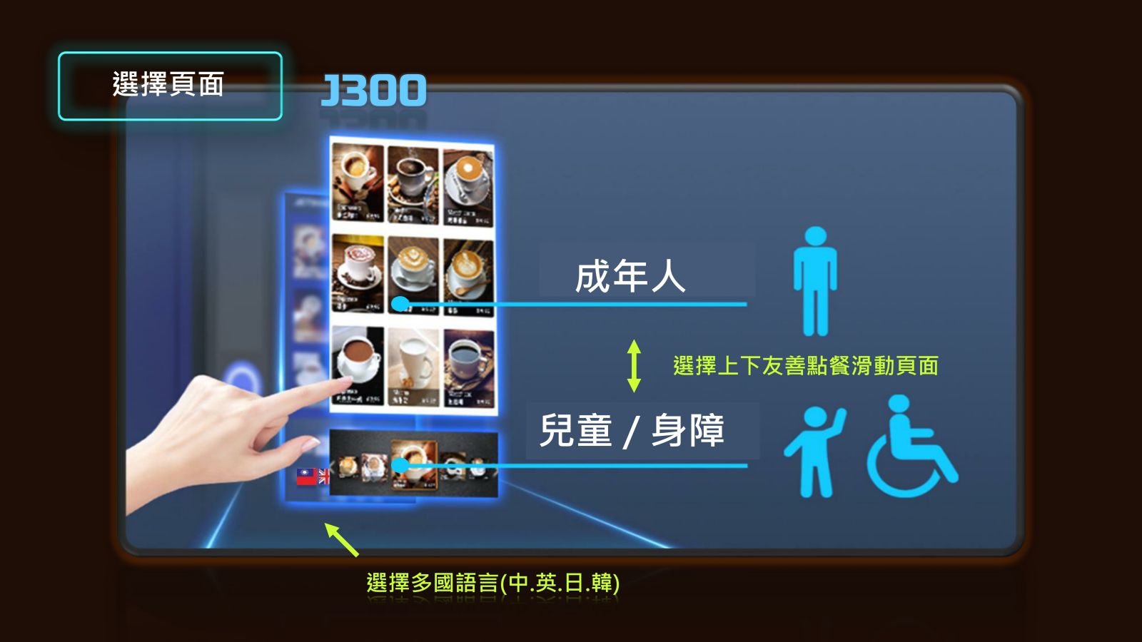輪椅及不便人士專用點餐螢幕,多國語言功能,客製化口味調整,16oz超大杯飲料,雲端發票生成,愛心發票捐贈,VIP會員卡,無卡取貨碼,環保杯折扣,杯蓋分配器,蓋杯置放台,自動升降門,遠端自動清洗..等功能,這都是AI智慧對人類提供友善的服務。