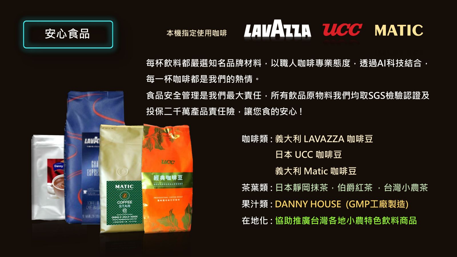 每杯飲料都嚴選知名品牌材料,以職人咖啡專業態度,透過AI科技結合,每一杯咖啡都是我們的熱情。