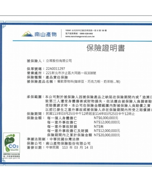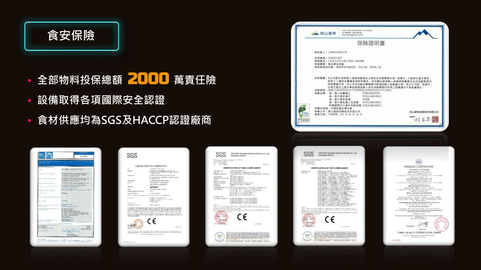 食品安全管理是我們最大責任,所有飲品原物料我們均取SGS檢驗認證及投保二千萬產品責任險,讓您食的安心 !