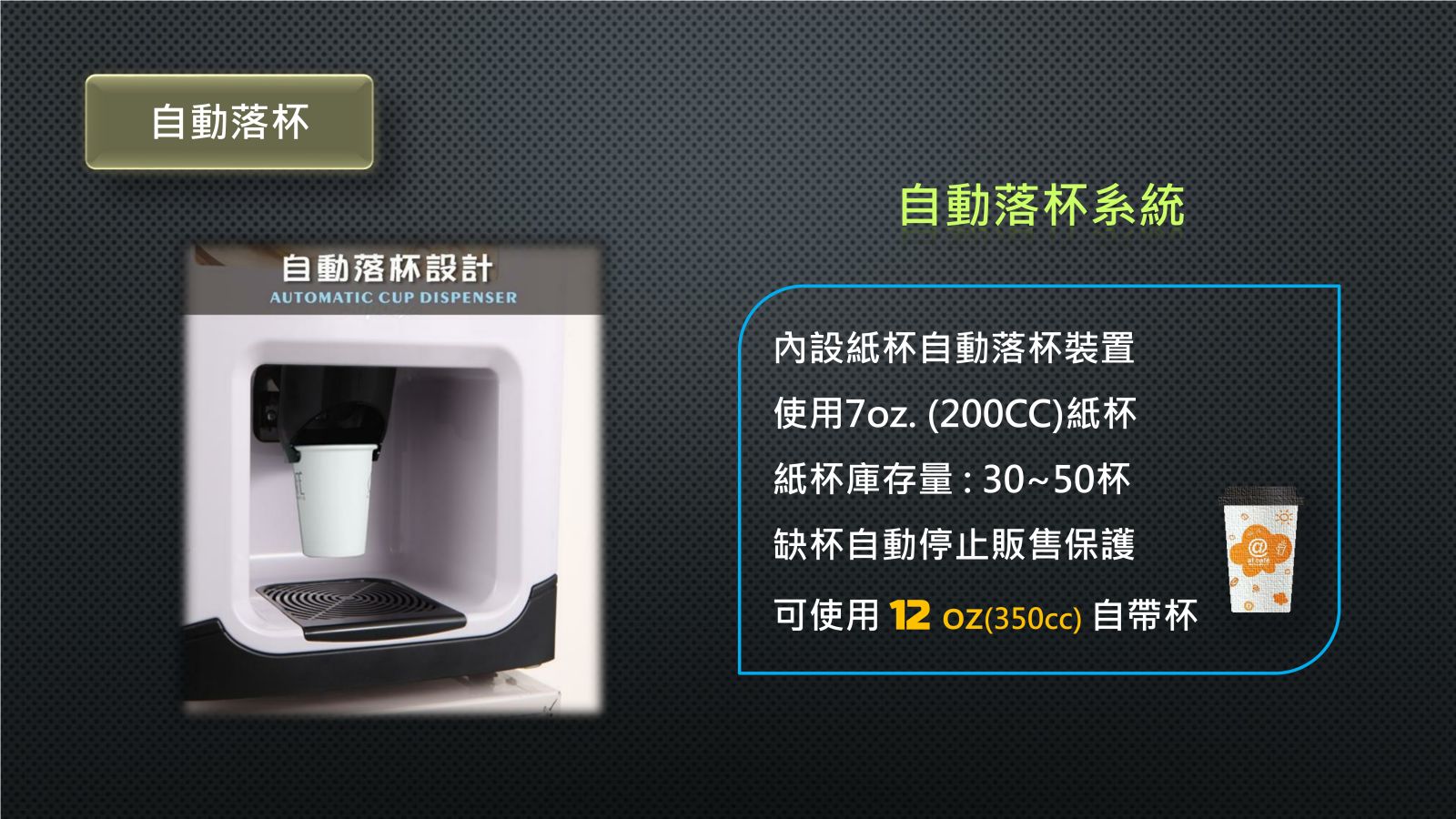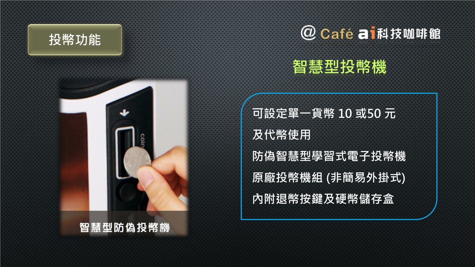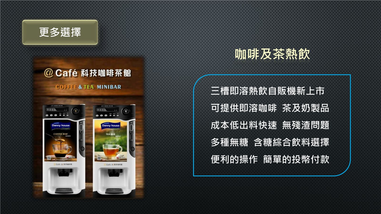 三種口味選擇,便利的快速的操作及投幣付款方式。這都是科技帶來全新24小時便利尊榮服務。