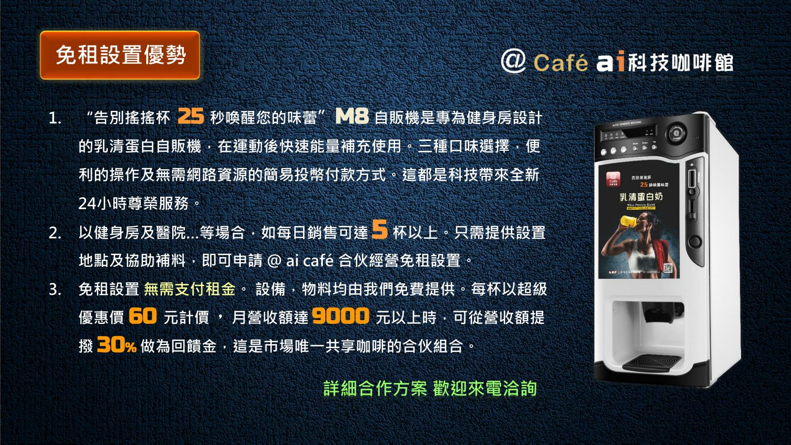 M8 自販機是專為健身房所設計的乳清蛋白奶自販機,提供大量運動後快速能量補充使用。