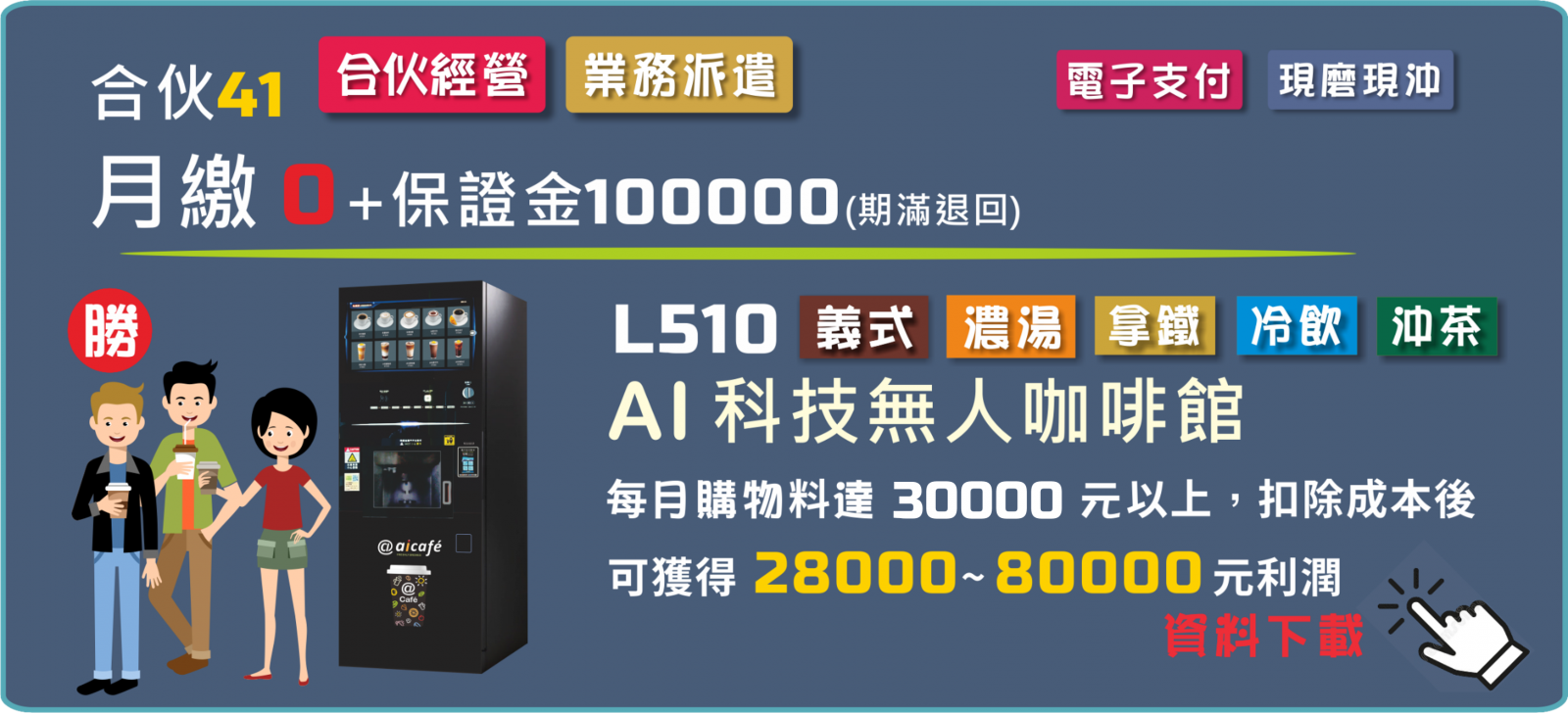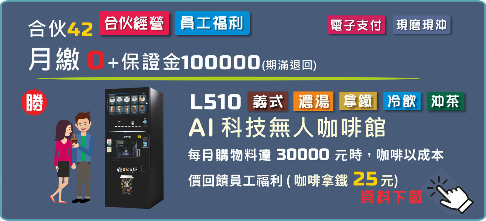 "合伙經營"是專為營業場所及大型企業大用量客戶設計。合作對象只需每月購買固定金額物料,@ ai cafe 即免費派遣 L510 "吧台高手"AI 無人自販機,供您 24 小時差遣服務。