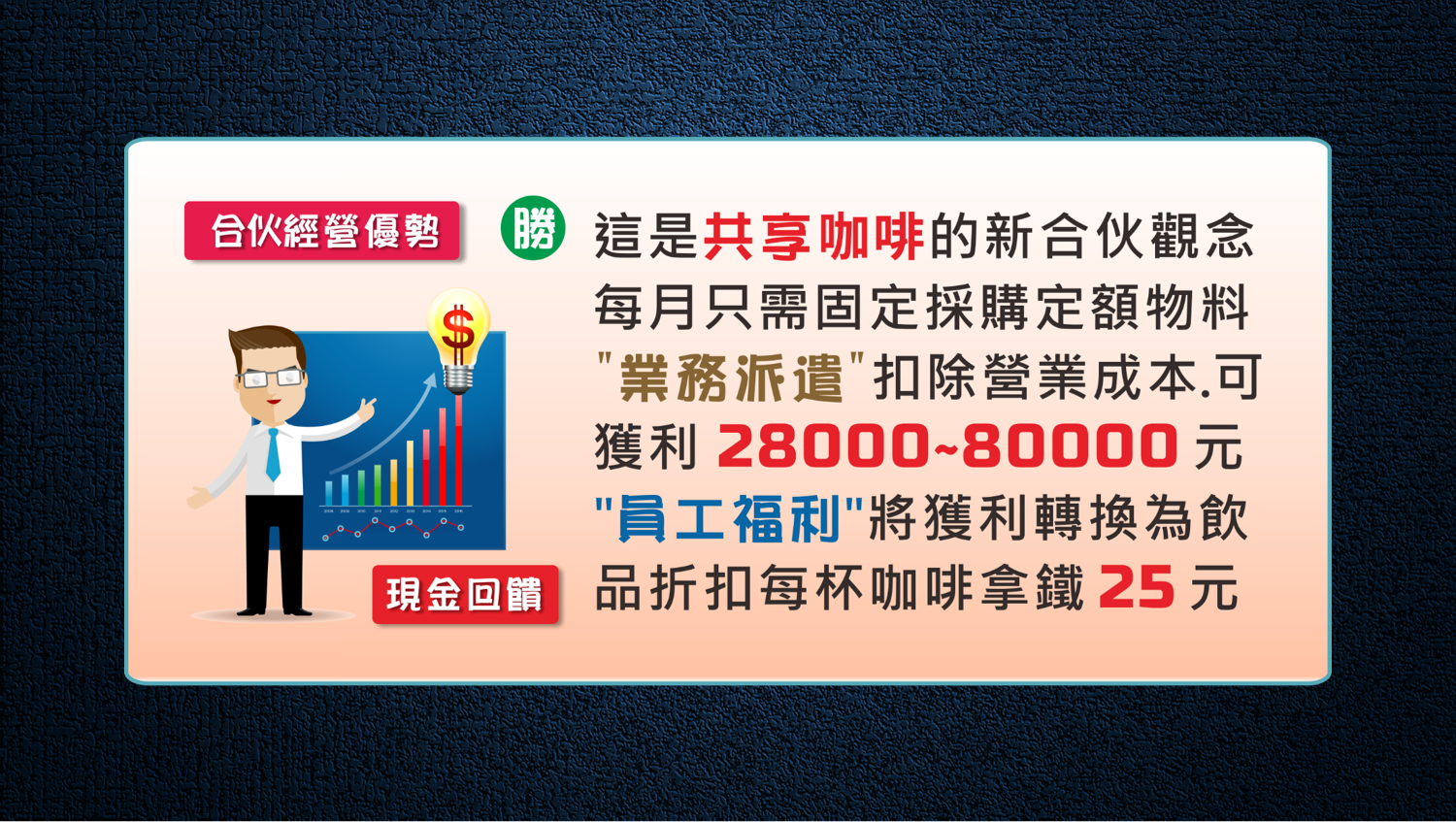 企業團體福委會在無需支付任何費用下,由獲利抵扣物料成本,即可提供員工超低價咖啡飲料服務。
