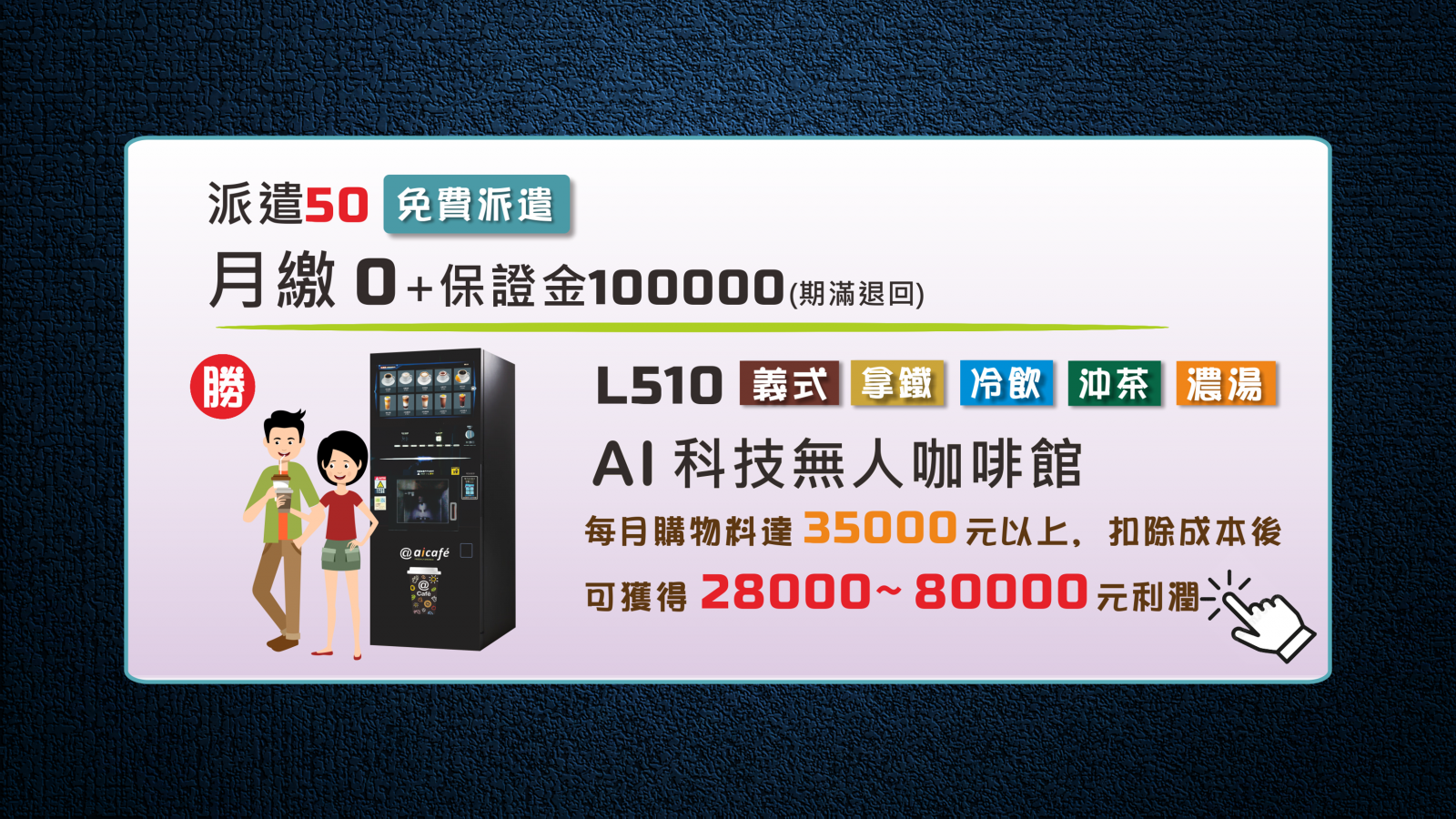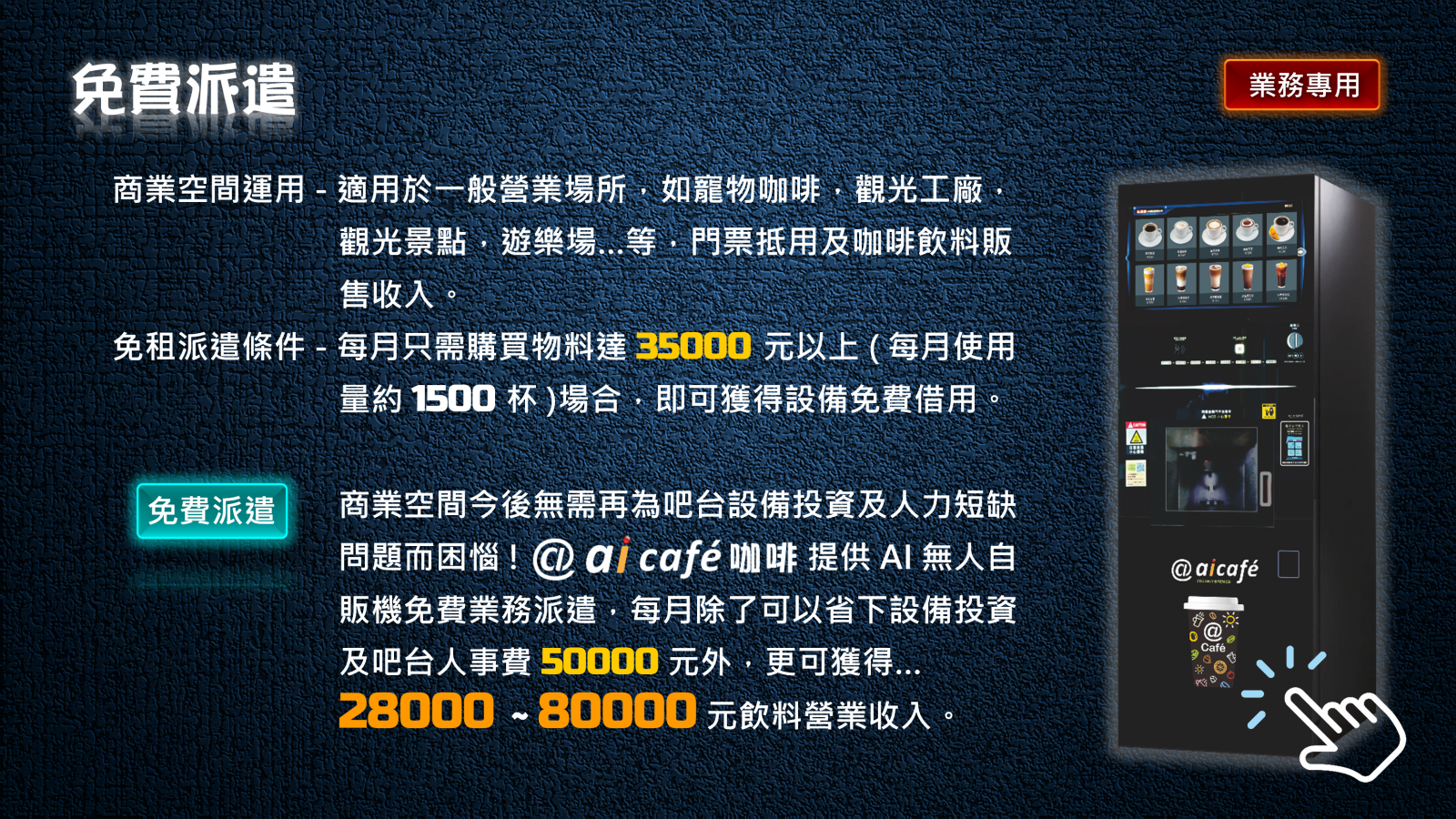 "免費派遣" 專為商業營業空間,因吧台人力短缺設計的免租借機方案。您每月只需固定採購定額物料,@ ai cafe 即可免費派遣 "L510 吧台高手" 供您 24 小時差遣服務,共同經營 AI 無人科技咖啡市場。