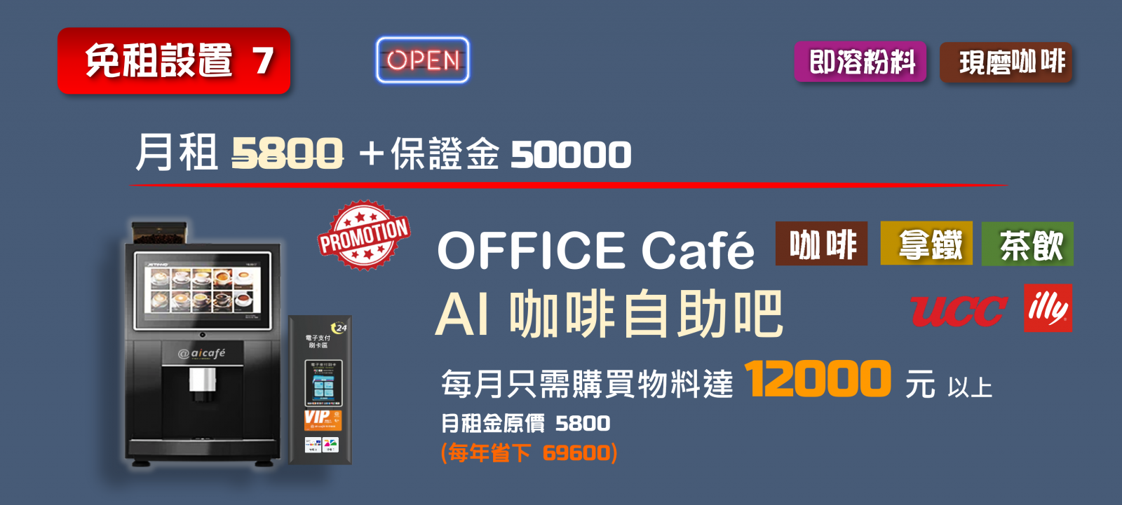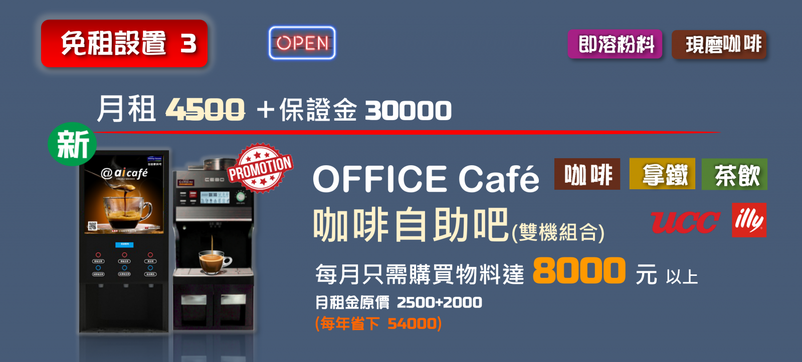 中大型企業辦公室咖啡大用戶,今後無需再支付月租金,每月只要購買物料達5000 元以上,ai cafe 即可免費提供多種不同自助吧台組合,輕鬆創建企業VIP貴賓室。