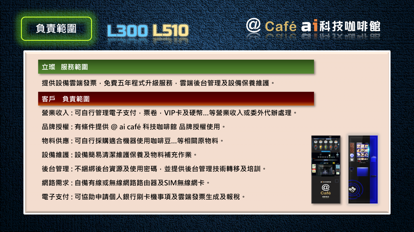 專為自營商創業投資設計方案,您可以把一台購機資金,分租三台設備。您的資金一下擴大為三倍營業收入並且可有效分擔"單機"市場營業風險。而後每月部分營業收入抵扣分期付款,三年後您就成為是真正擁有三台設備的連鎖咖啡店的大老闆。