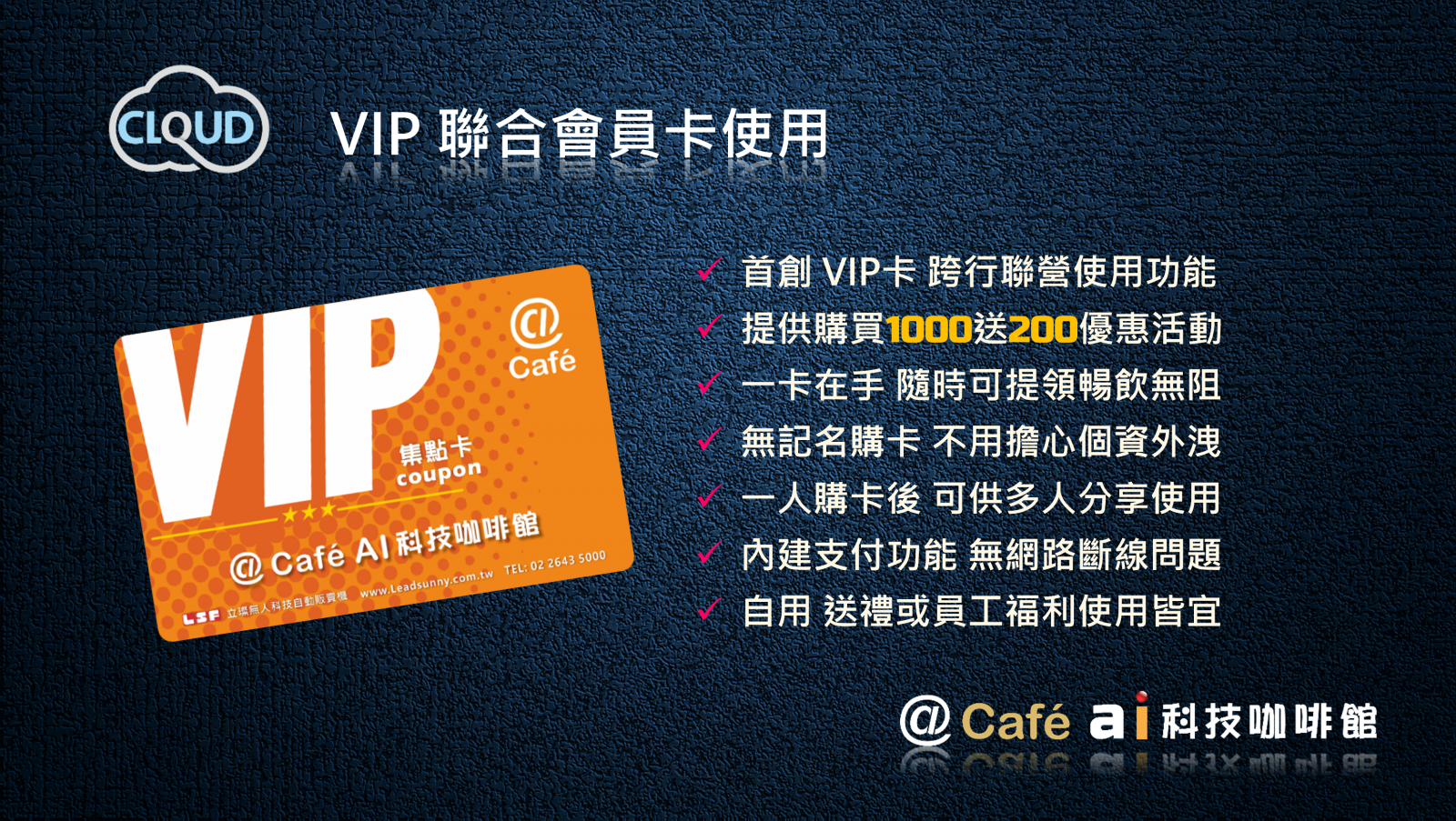 @ aicafe 可以提供品牌授權使用及VIP卡以聯營方式,共享咖啡新資源,為您創造更多利潤空間。我們讓您個人投資獲利,瞬間擴大好幾倍!