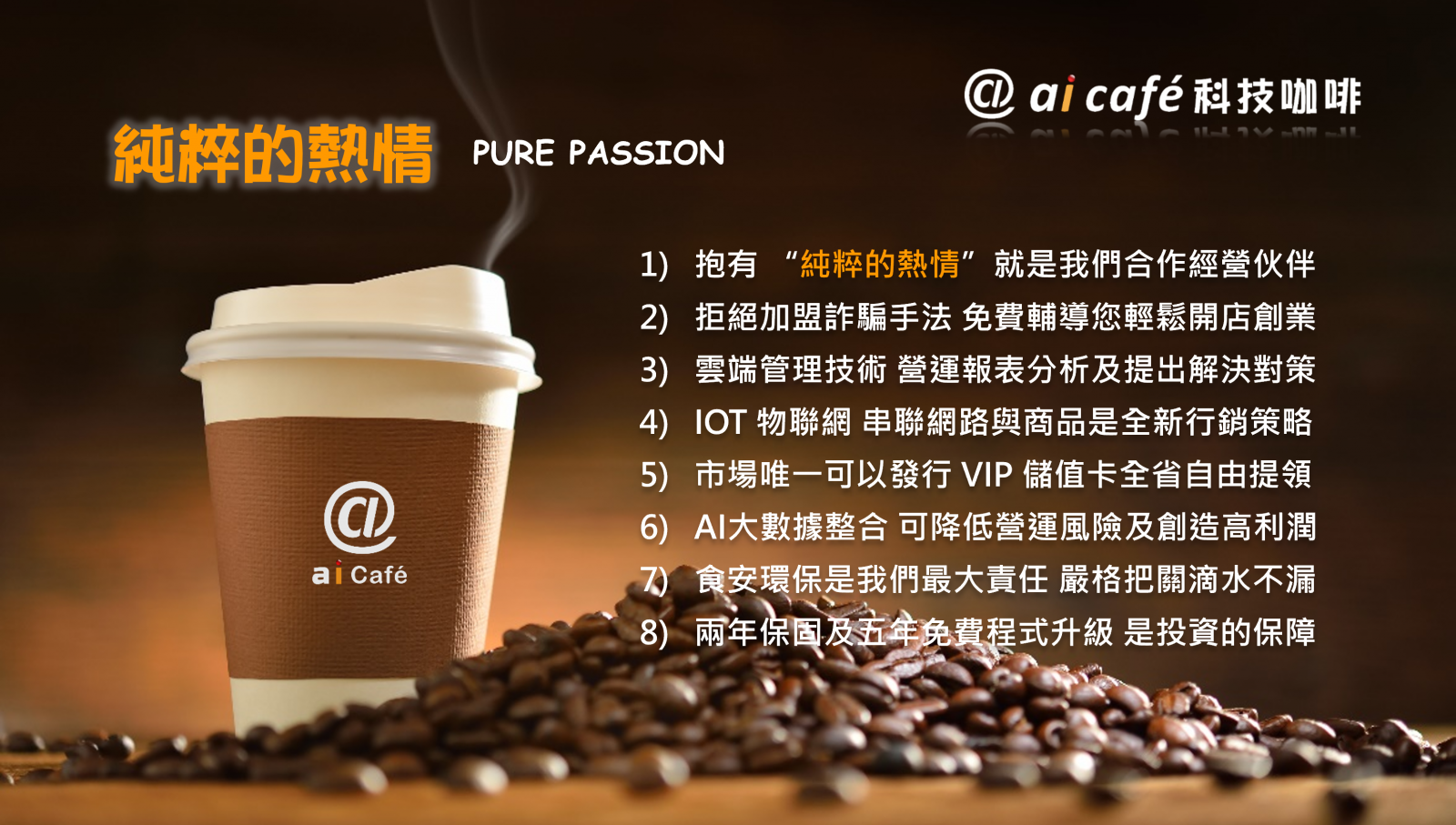 @ ai café 依照投資環境及人數不同,AI 專業評估選擇最有利的投資方案。現在加入除可省下高額加盟金,人事及店租成本用外,飲料高達 60~65 % 獲利,是目前投資報酬率最高的選擇。